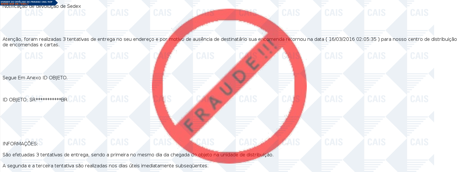 | tipo | FRAUDE - Encomenda Sedex - Correios | ID: 47281 |