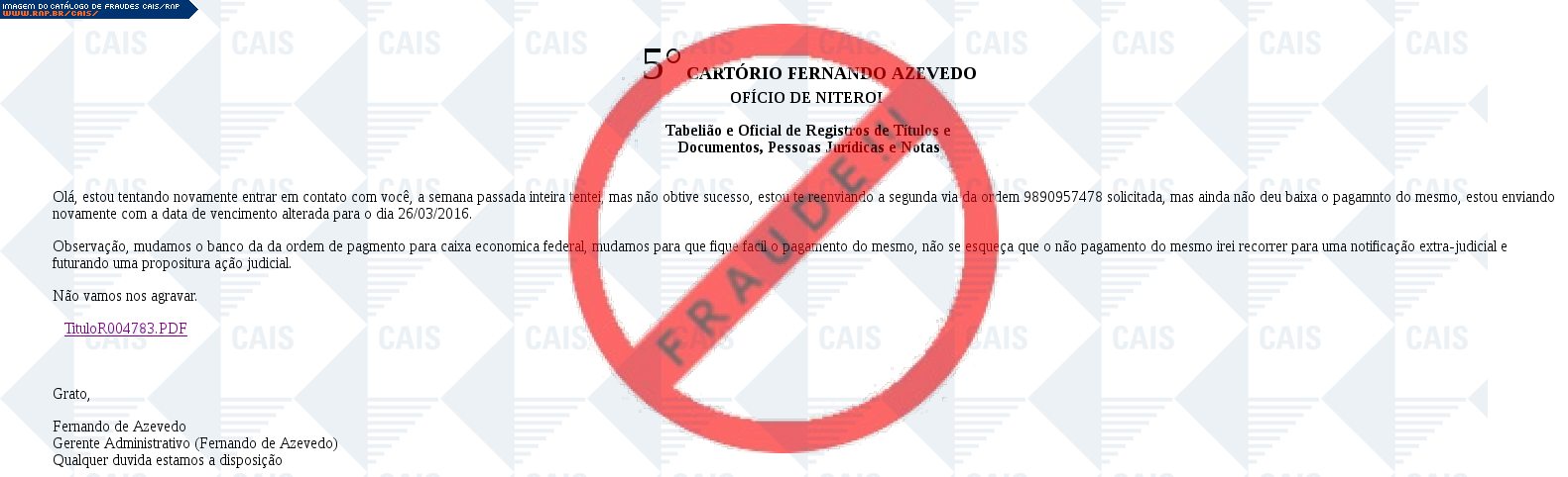 Esta página tem função informativa e educativa. Exibe uma coleção de imagens de phishing scam (fraudes eletrônicas) ou malware (código malicioso) veiculados por meio de spam (e-mail não-solicitado). Trata-se de conteúdo exemplificativo, não exaustivo, uma vez que não é possível contemplar todos os casos de fraudes existentes. Assim, caso você tenha conhecimento de um exemplar que não esteja aqui presente, isto não significa que não seja válido ou real. Inclusive incentivamos que você o envie para análise do CAIS para que, se for o caso, passe a integrar o nosso acervo.