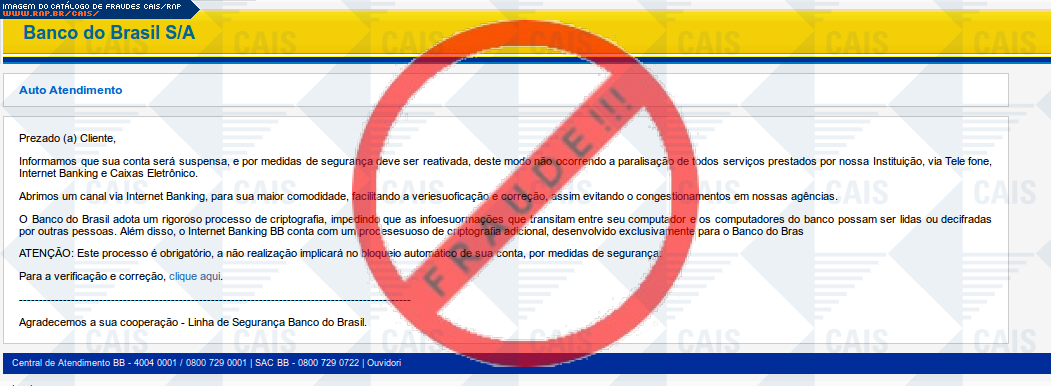 Esta página tem função informativa e educativa. Exibe uma coleção de imagens de phishing scam (fraudes eletrônicas) ou malware (código malicioso) veiculados por meio de spam (e-mail não-solicitado). Trata-se de conteúdo exemplificativo, não exaustivo, uma vez que não é possível contemplar todos os casos de fraudes existentes. Assim, caso você tenha conhecimento de um exemplar que não esteja aqui presente, isto não significa que não seja válido ou real. Inclusive incentivamos que você o envie para análise do CAIS para que, se for o caso, passe a integrar o nosso acervo.