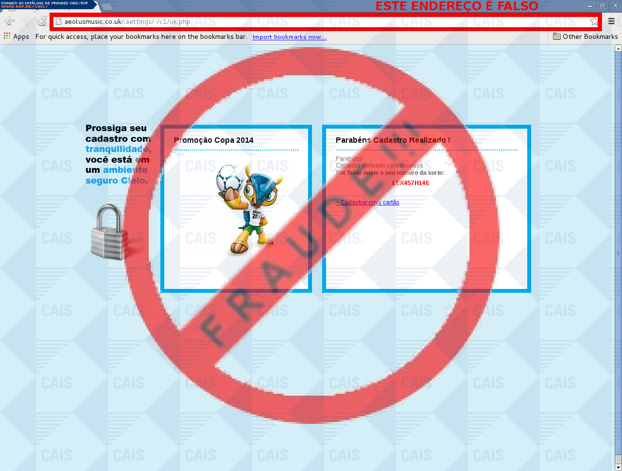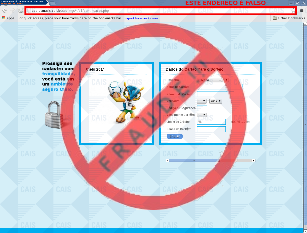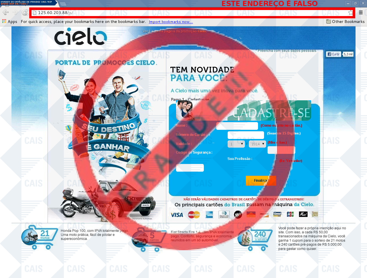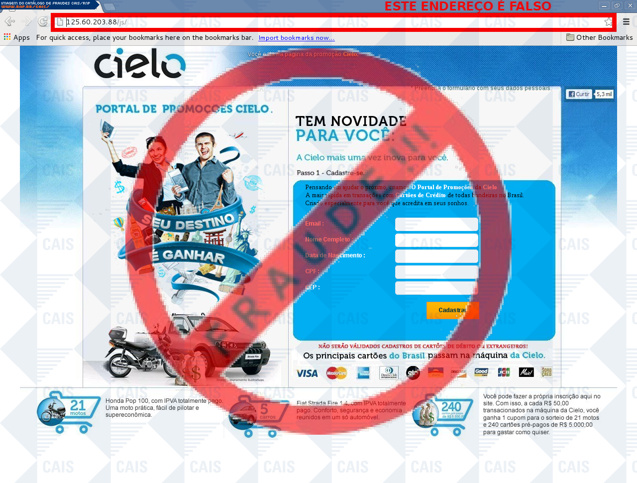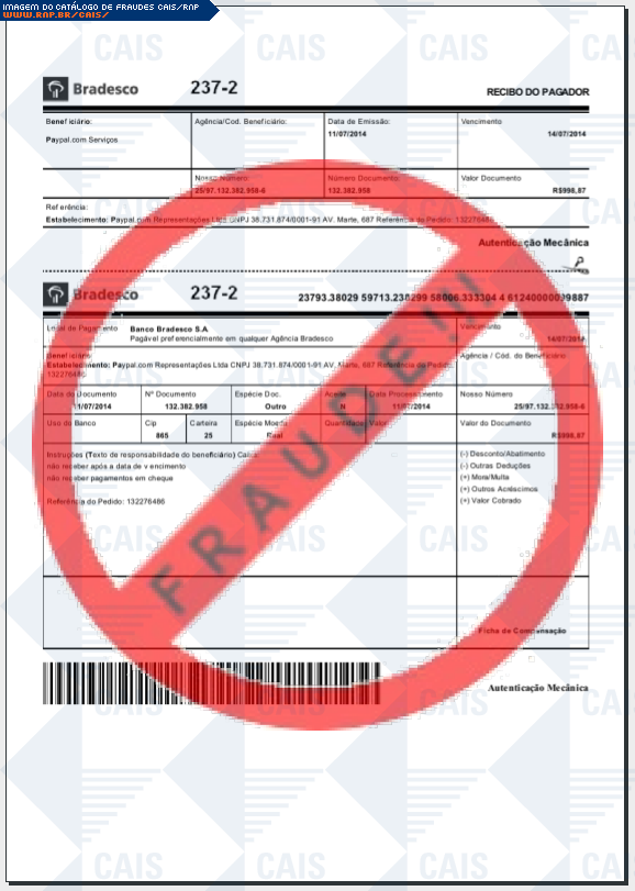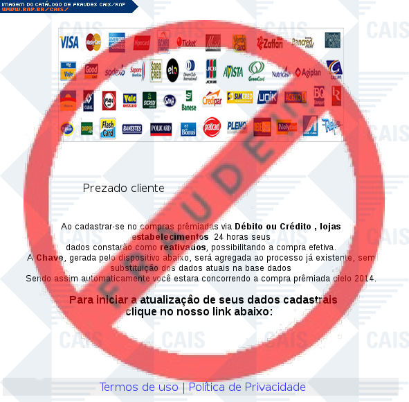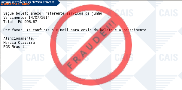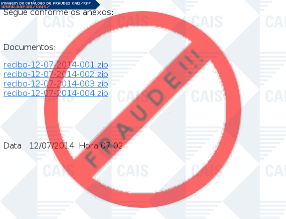 Esta página tem função informativa e educativa. Exibe uma coleção de imagens de phishing scam (fraudes eletrônicas) ou malware (código malicioso) veiculados por meio de spam (e-mail não-solicitado). Trata-se de conteúdo exemplificativo, não exaustivo, uma vez que não é possível contemplar todos os casos de fraudes existentes. Assim, caso você tenha conhecimento de um exemplar que não esteja aqui presente, isto não significa que não seja válido ou real. Inclusive incentivamos que você o envie para análise do CAIS para que, se for o caso, passe a integrar o nosso acervo.