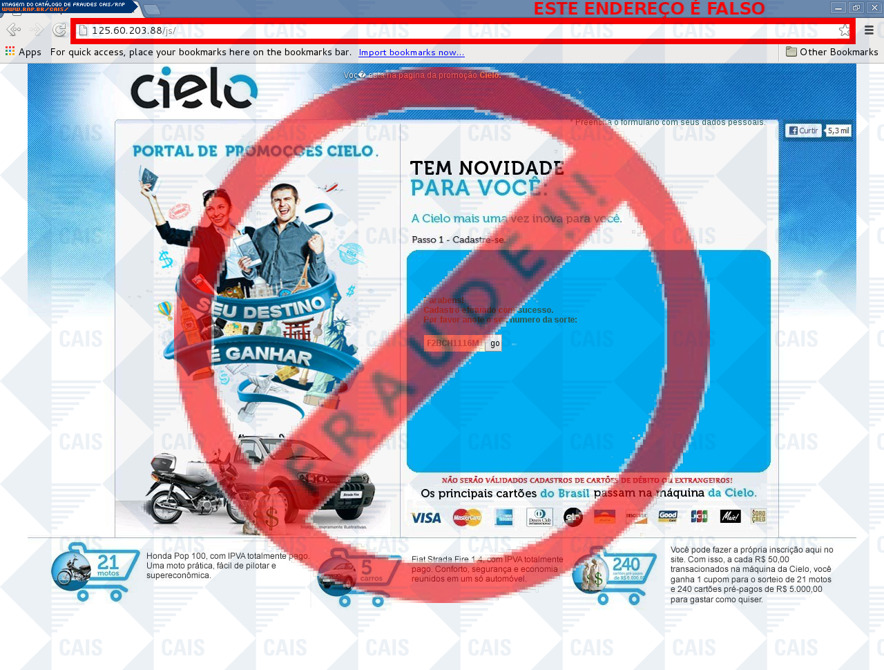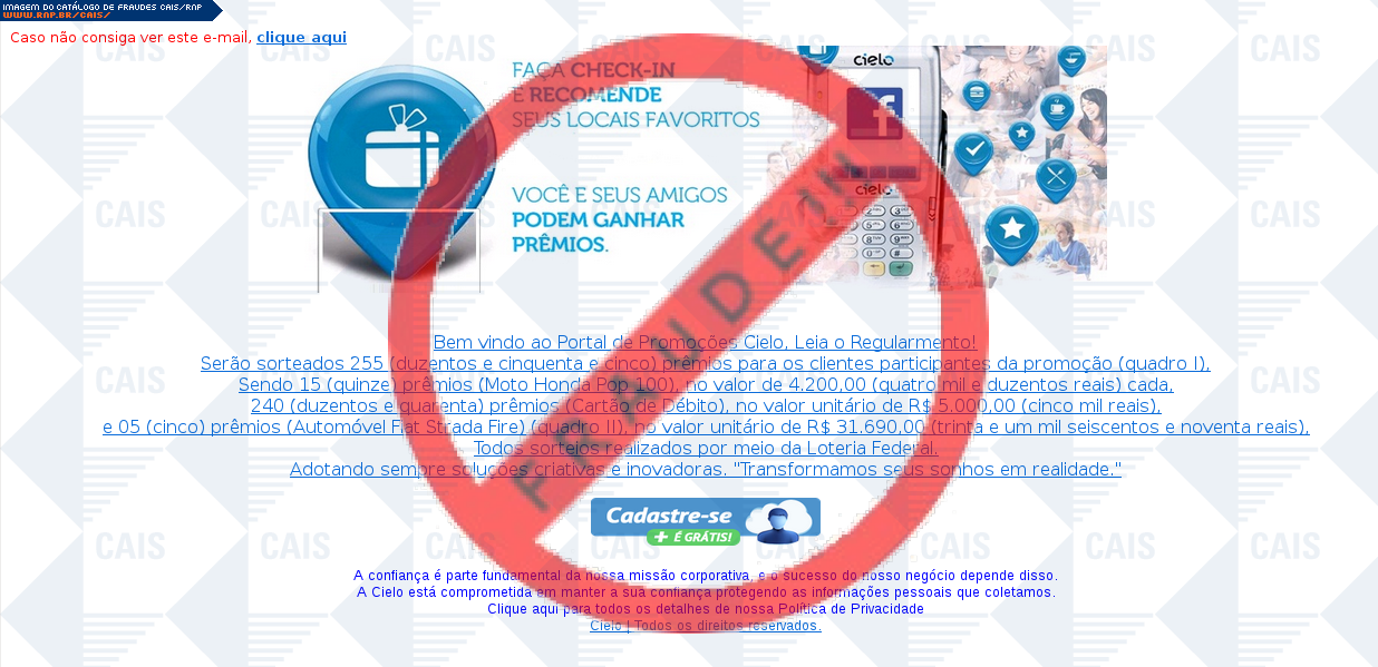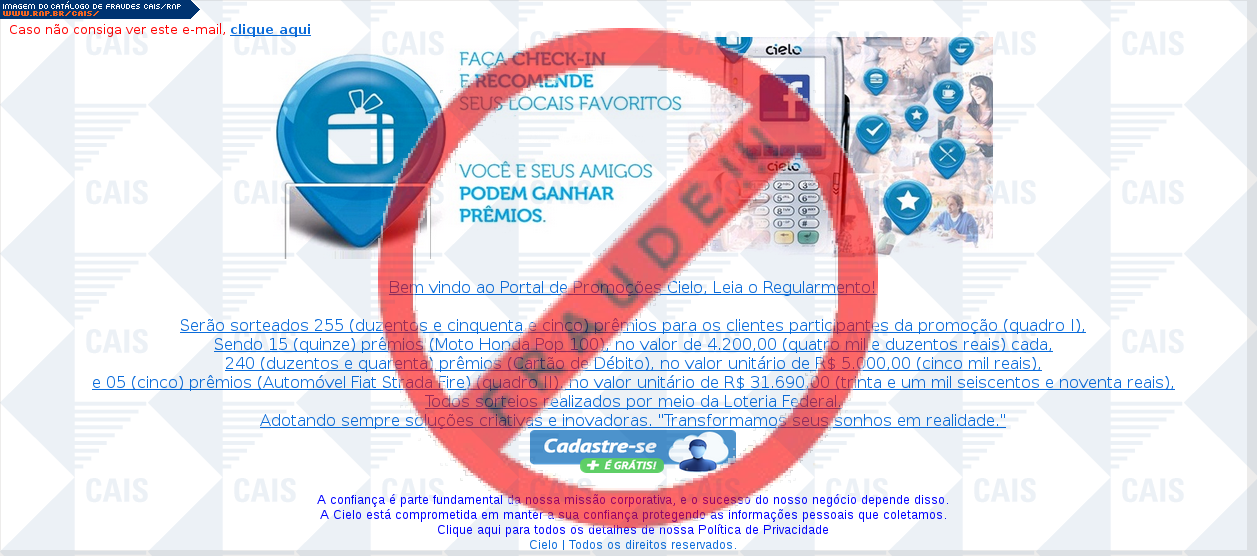 | comentário | A vítima recebe um e-mail informando sobre promoções e prêmios em dinheiro, sendo necessário para participar realizar um cadastro no link disponibilizado. No entanto a página é falsa, destinada a roubar os dados do cartão de credito do usuário. | |