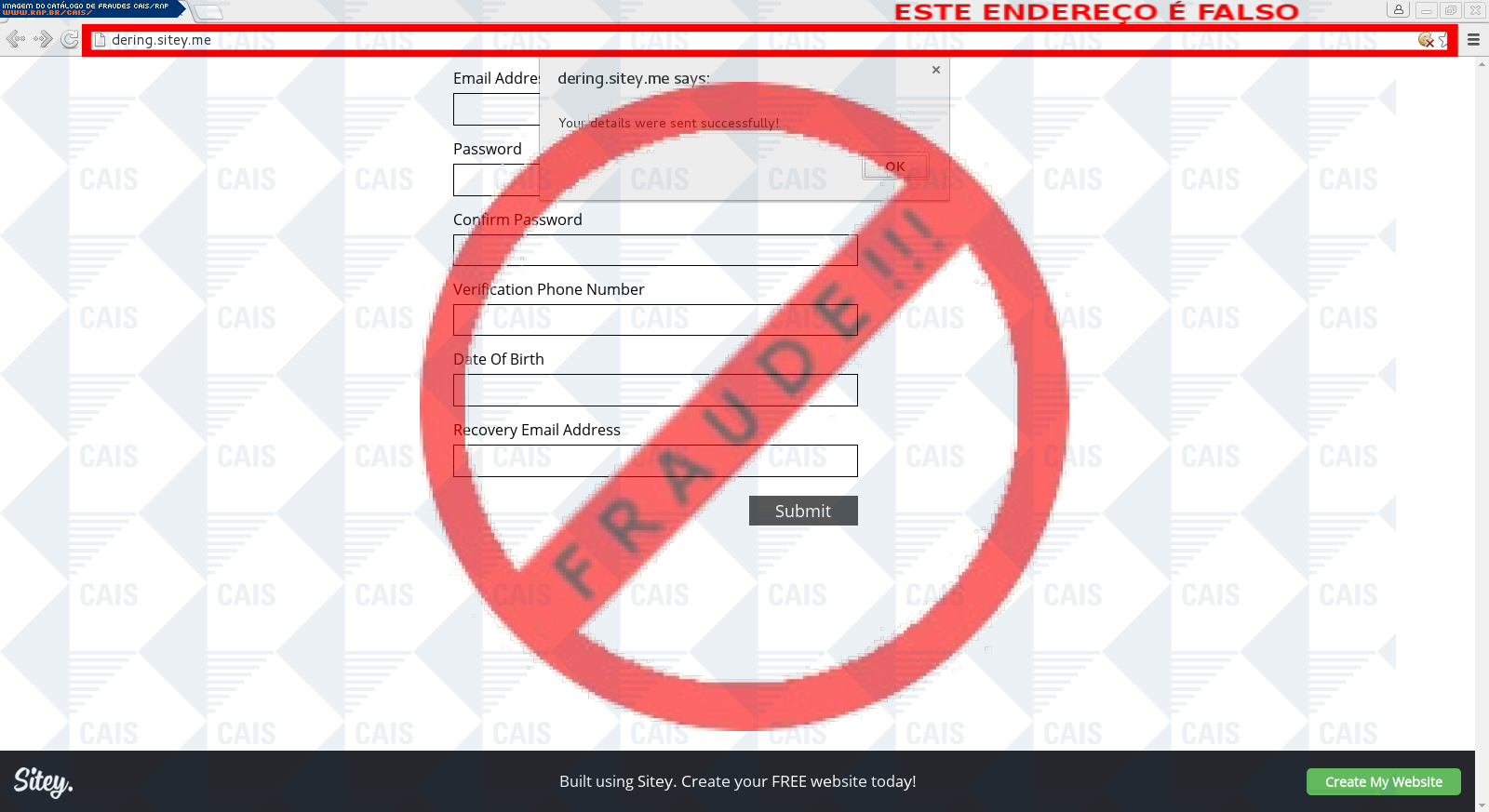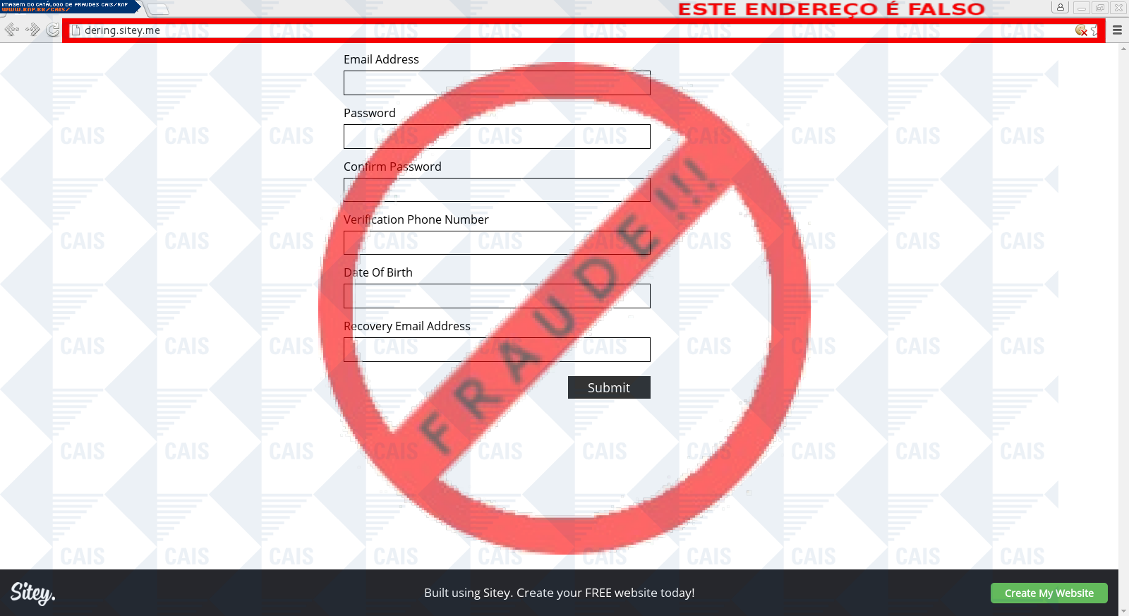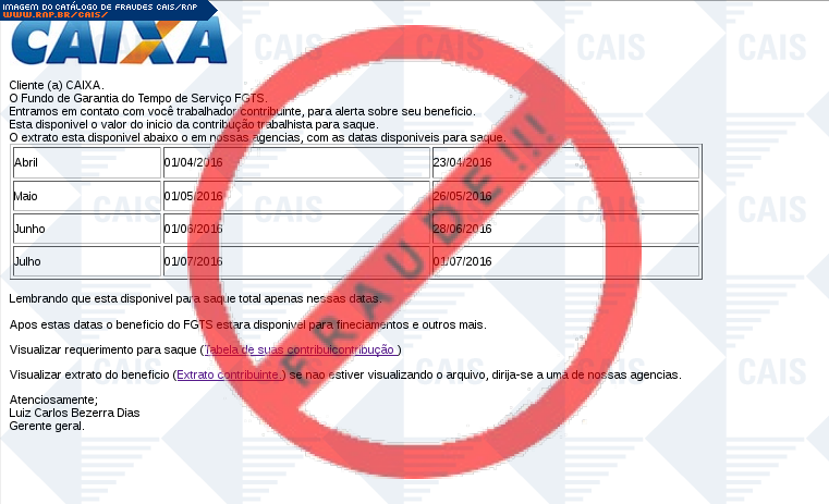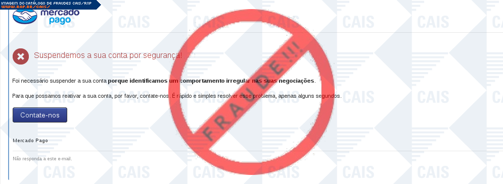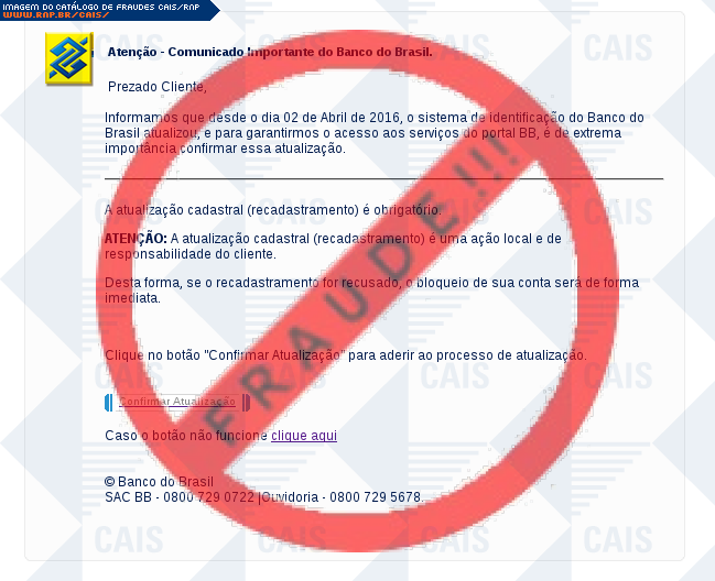 Esta página tem função informativa e educativa. Exibe uma coleção de imagens de phishing scam (fraudes eletrônicas) ou malware (código malicioso) veiculados por meio de spam (e-mail não-solicitado). Trata-se de conteúdo exemplificativo, não exaustivo, uma vez que não é possível contemplar todos os casos de fraudes existentes. Assim, caso você tenha conhecimento de um exemplar que não esteja aqui presente, isto não significa que não seja válido ou real. Inclusive incentivamos que você o envie para análise do CAIS para que, se for o caso, passe a integrar o nosso acervo.
