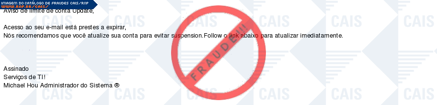 | comentário | O usuário recebe uma mensagem informando que a capacidade de armazenamento de sua conta de e-mail vai expirar sendo necessário uma atualização no link disponibilizado, entretanto a página é falsa criada para roubar os dados do e-mail da vítima. | |