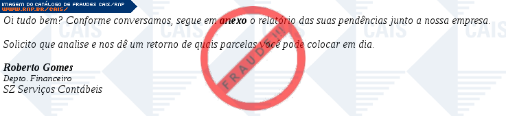 | comentário | A vítima recebe um email dizendo que em anexo estão pendências dela com a empresa remetente. Entretanto, o anexo se trata de um malware de nome Artemis!2322A64BDD87 que tenta infectar o computador do usuário. | |