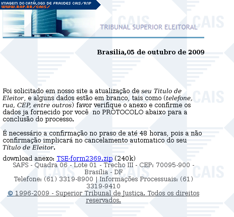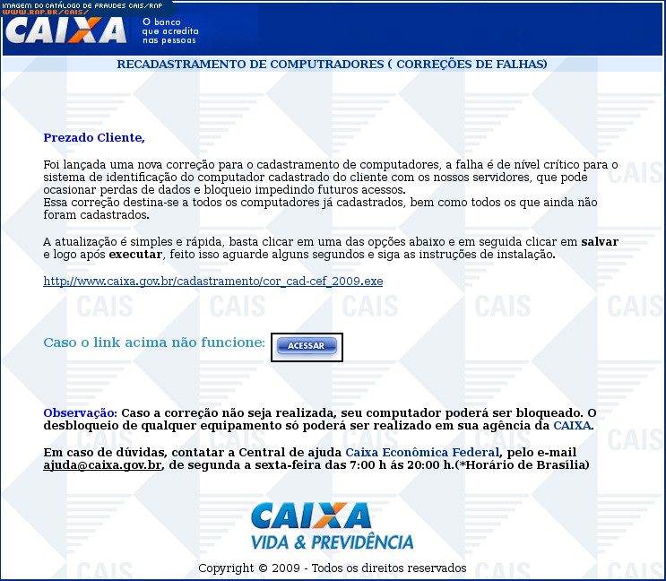 Esta página tem função informativa e educativa. Exibe uma coleção de imagens de phishing scam (fraudes eletrônicas) ou malware (código malicioso) veiculados por meio de spam (e-mail não-solicitado). Trata-se de conteúdo exemplificativo, não exaustivo, uma vez que não é possível contemplar todos os casos de fraudes existentes. Assim, caso você tenha conhecimento de um exemplar que não esteja aqui presente, isto não significa que não seja válido ou real. Inclusive incentivamos que você o envie para análise do CAIS para que, se for o caso, passe a integrar o nosso acervo.