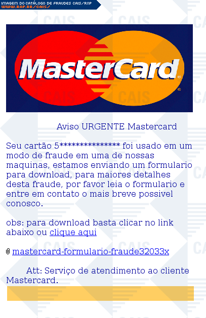 | comentário | Fraude que utiliza o nome da Mastercard informando que seu cartão foi usado em um modo de fraude, e possui um link para um suposto formulario para download. Ao clicar no link é feito o download do arquivo malicioso identificado como Trojan.Downloader.Delf.RQQ... (leia mais) | |