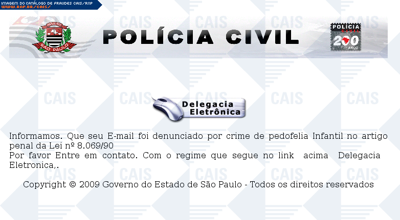 | comentário | Fraude que utiliza o nome da Polícia Civil informando que seu e-mail foi denunciado por crime de pedofilia Infantil. A mensagem diz que é necessário fazer contato com a delegacia eletrônica através de um link, que aponta para um arquivo malicioso. | |