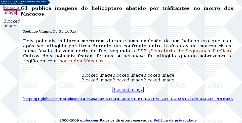 | comentário | Fraude que possui links para supostas fotos de um helicóptero da polícia militar que foi abatido por traficantes. O link para a notícia aponta para o software malicioso Gen:Trojan.Heur.cq0@tKeYsmei. | |