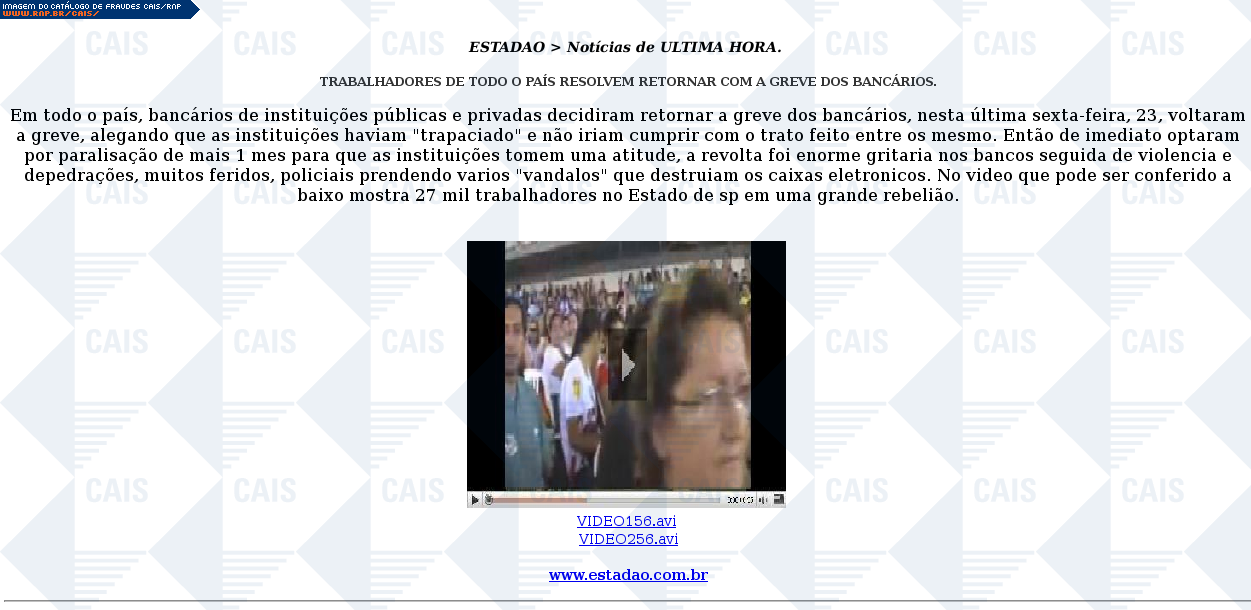 | comentário | Fraude se passando por notícia do jornal Estadão informando a retomada da greve dos bancários. A mensagem, escrita em português sofrível, diz que houveram vários momentos de tensão entre os manifestantes e a polícia. São fornecidos dois links que levariam... (leia mais) | |