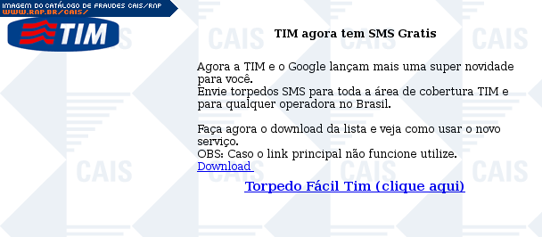 | comentário | Mensagem se passando pela TIM dizendo que devido a uma parceria entre a TIM e a Google passa a ser possível enviar torpedos SMS da TIM para todo Brasil. A fraude fornece dois links através dos quais seria possível obter informações mais detalhadas sobre o... (leia mais) | |