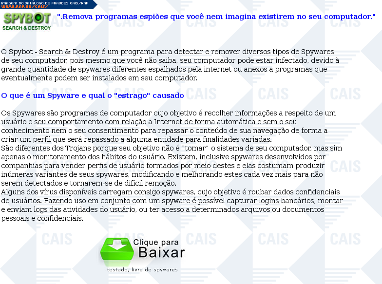 | comentário | Mensagem falsa fazendo propaganda do programa SpyBot, "um programa para detectar e remover diversos tipos de Spywares de seu computador". O texto informa diversas qualidades do software e ao final fornece um link para download do mesmo. O link direciona a... (leia mais) | |