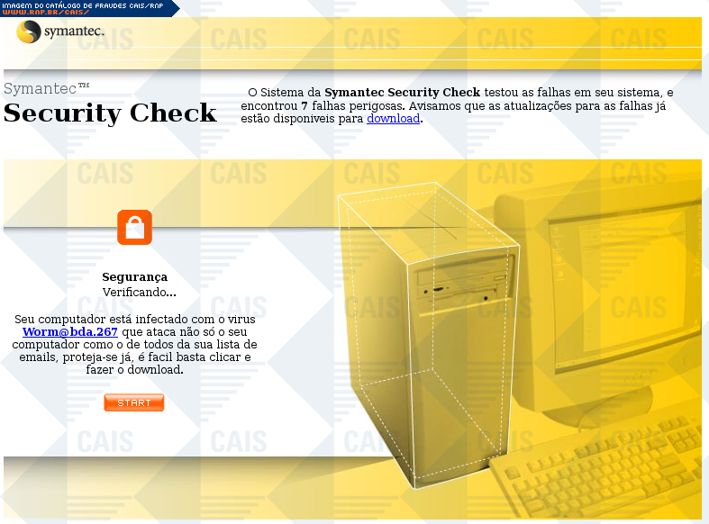 | comentário | Comunicado se passando pela Symantec dizendo que o sistema da vítima foi testado e 7 falhas graves foram encontradas. As atualizações para tais falhas já estariam disponíveis e poderiam ser acessadas pelo link fornecido na fraude. Tal link direciona a vítima... (leia mais) | |