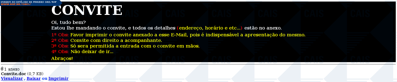 | comentário | Fraude simulando email enviado por algum conhecido enviando um convite para festa. O texto diz que informações adicionais e o convite a ser impresso estão em anexo. Tais anexos são links que direcionam a vítima para um arquivo malicioso identificado como... (leia mais) | |