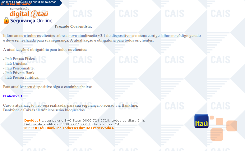 | comentário | A fraude contém um link para a suposta atualização do dispositivo iToken para a versão 3.1. O conteúdo malicioso não estava mais disponível no momento da análise. | |