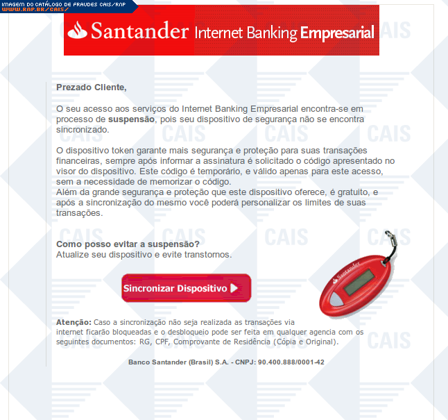 | comentário | A fraude contém um link para a suposta sincronização do dispositivo Token. O conteúdo malicioso não estava mais disponível no momento da análise. | |