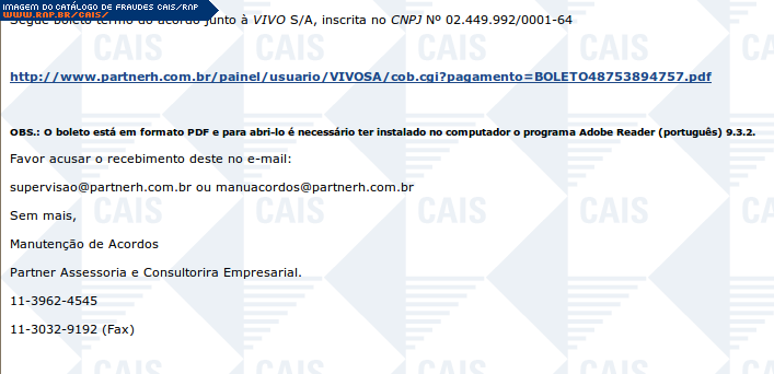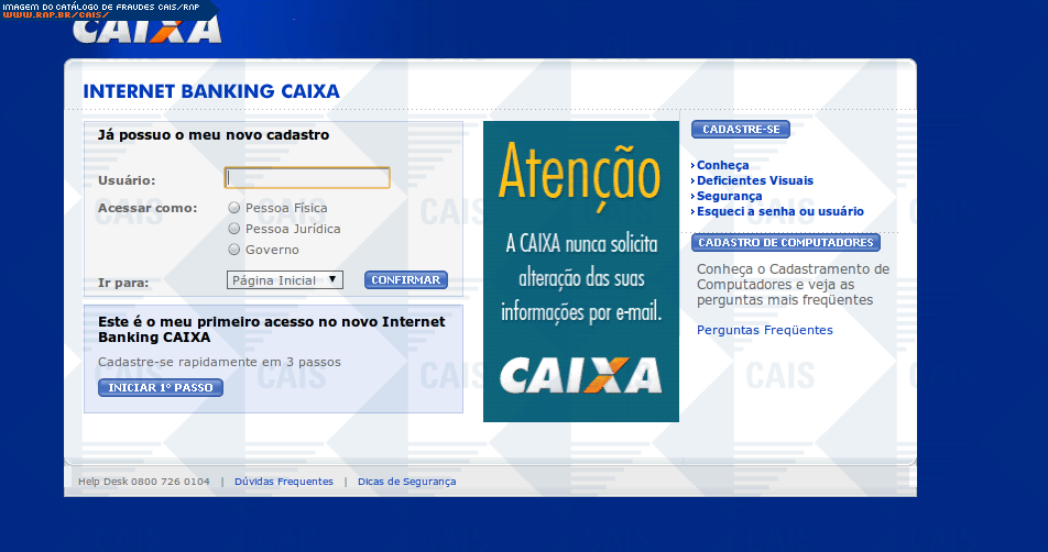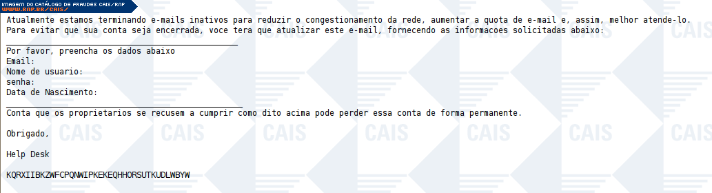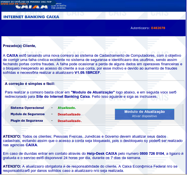 Esta página tem função informativa e educativa. Exibe uma coleção de imagens de phishing scam (fraudes eletrônicas) ou malware (código malicioso) veiculados por meio de spam (e-mail não-solicitado). Trata-se de conteúdo exemplificativo, não exaustivo, uma vez que não é possível contemplar todos os casos de fraudes existentes. Assim, caso você tenha conhecimento de um exemplar que não esteja aqui presente, isto não significa que não seja válido ou real. Inclusive incentivamos que você o envie para análise do CAIS para que, se for o caso, passe a integrar o nosso acervo.