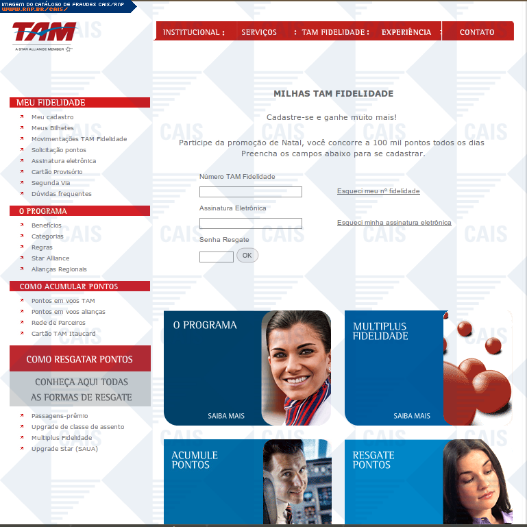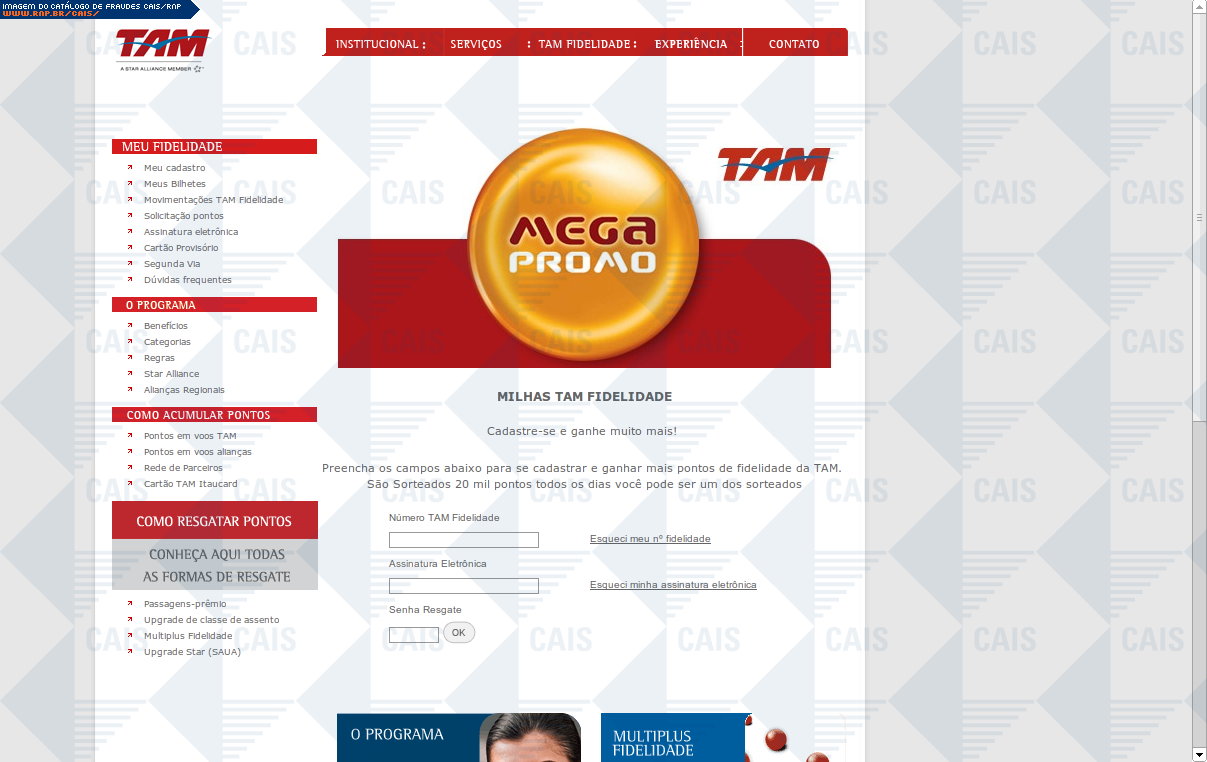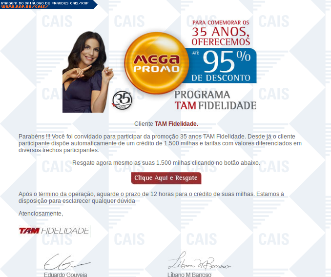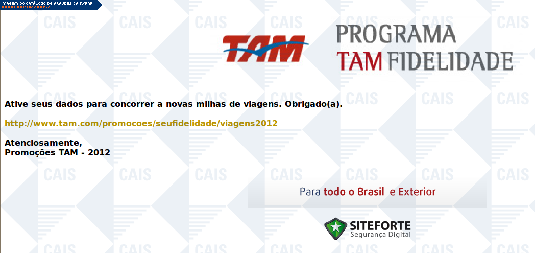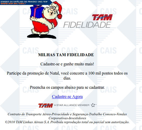 | comentário | A fraude contém um link para o cadastro em uma promoção da TAM. O link leva a uma página falsa, destinada a coletar dados pessoais da vítima. | |