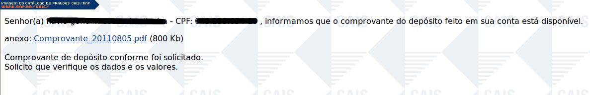 | comentário | A fraude se passa pelo envio de um comprovante de depósito. A mensagem contém o nome e cpf da vítima. O suposto comprovante é na verdade o software malicioso identificado como Trojan.Win32.Jorik.Vobfus.kfw (Kaspersky). | |
