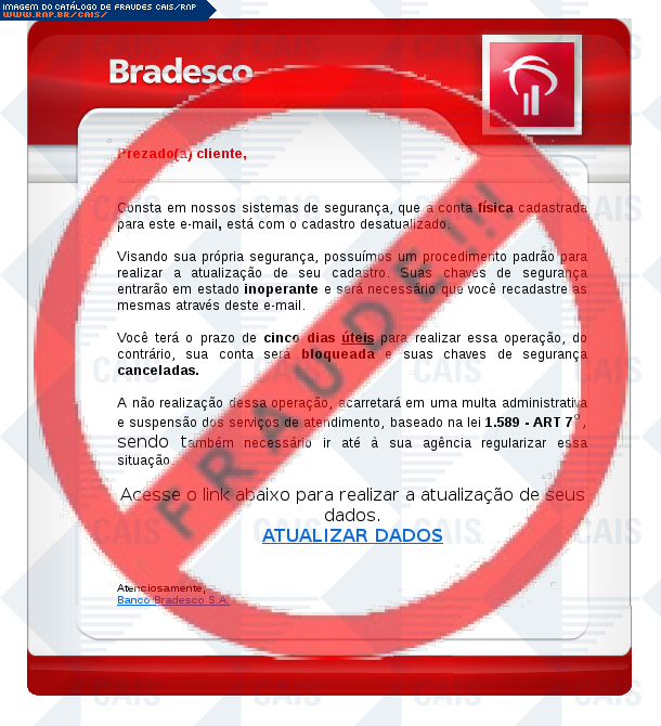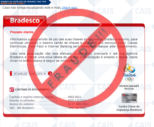 | comentário | O usuário recebe um e-mail informando que sua chave de segurança da conta do banco Bradesco expirou sendo necessário realizar uma atualização no link disponibilizado, entretanto a página fornecida é falsa criada para roubar os dados bancários da vítima. | |