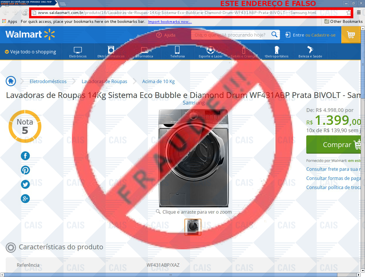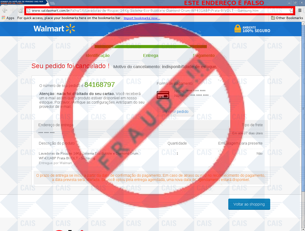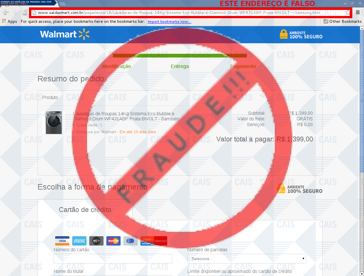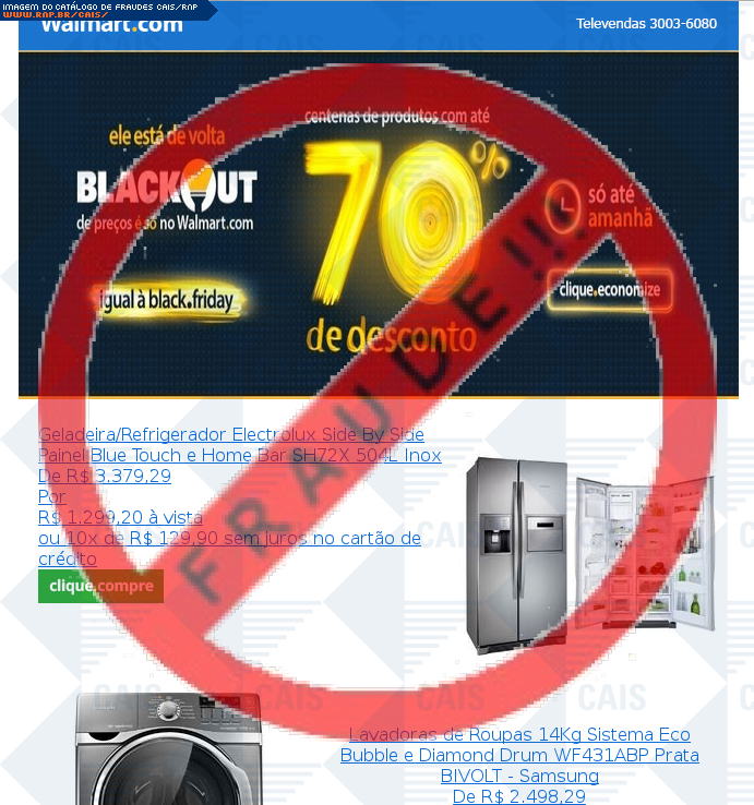 | comentário | A vítima recebe um e-mail informando sobre promoções no site de compra da Walmart disponibilizando link de vários produtos em desconto, no entanto a página é falsa destinada a roubar as informações pessoais e do cartão do usuário. | |