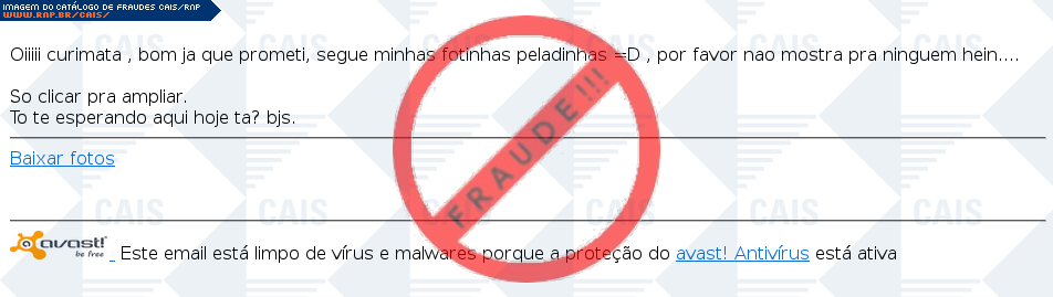 | comentário | O usuário recebe uma mensagem contendo fotos íntimas de uma mulher disponível para download, no entanto o arquivo originado é malicioso criado para roubar informações da vítima e instalar outros arquivos fraudulentos. | |