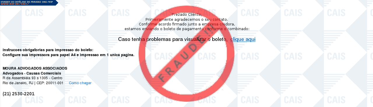 Esta página tem função informativa e educativa. Exibe uma coleção de imagens de phishing scam (fraudes eletrônicas) ou malware (código malicioso) veiculados por meio de spam (e-mail não-solicitado). Trata-se de conteúdo exemplificativo, não exaustivo, uma vez que não é possível contemplar todos os casos de fraudes existentes. Assim, caso você tenha conhecimento de um exemplar que não esteja aqui presente, isto não significa que não seja válido ou real. Inclusive incentivamos que você o envie para análise do CAIS para que, se for o caso, passe a integrar o nosso acervo.