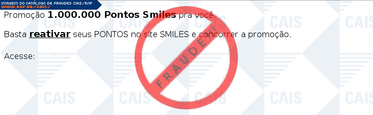 | comentário | O usuário recebe uma mensagem solicitando reativação dos pontos, no programa de milhas da companhia aérea Gol, no link disponível. Entretanto o site é falso criado para roubar dados da vítima. | |