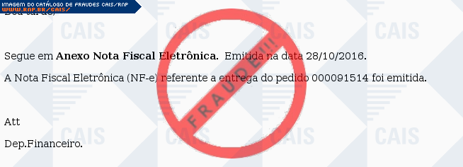 Esta página tem função informativa e educativa. Exibe uma coleção de imagens de phishing scam (fraudes eletrônicas) ou malware (código malicioso) veiculados por meio de spam (e-mail não-solicitado). Trata-se de conteúdo exemplificativo, não exaustivo, uma vez que não é possível contemplar todos os casos de fraudes existentes. Assim, caso você tenha conhecimento de um exemplar que não esteja aqui presente, isto não significa que não seja válido ou real. Inclusive incentivamos que você o envie para análise do CAIS para que, se for o caso, passe a integrar o nosso acervo.