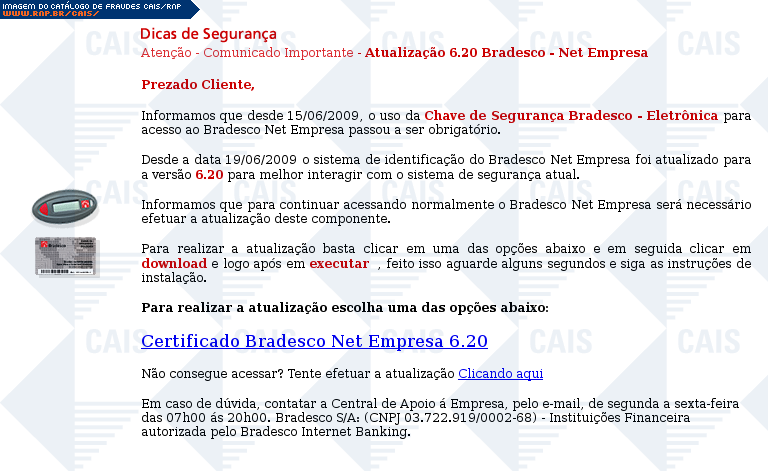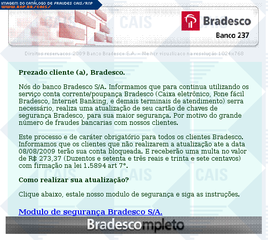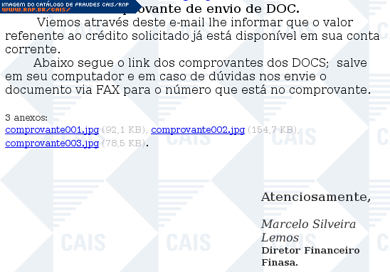 Esta página tem função informativa e educativa. Exibe uma coleção de imagens de phishing scam (fraudes eletrônicas) ou malware (código malicioso) veiculados por meio de spam (e-mail não-solicitado). Trata-se de conteúdo exemplificativo, não exaustivo, uma vez que não é possível contemplar todos os casos de fraudes existentes. Assim, caso você tenha conhecimento de um exemplar que não esteja aqui presente, isto não significa que não seja válido ou real. Inclusive incentivamos que você o envie para análise do CAIS para que, se for o caso, passe a integrar o nosso acervo.
