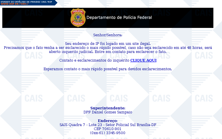 | comentário | Mensagem supostamente da polícia federal dizendo que o IP da vítima foi logado em um site ilegal. O texto fornece um link pelo qual seria possível ver mais detalhes do inquérito. O link leva a conteúdo malicioso não disponível no momento da análise. | |