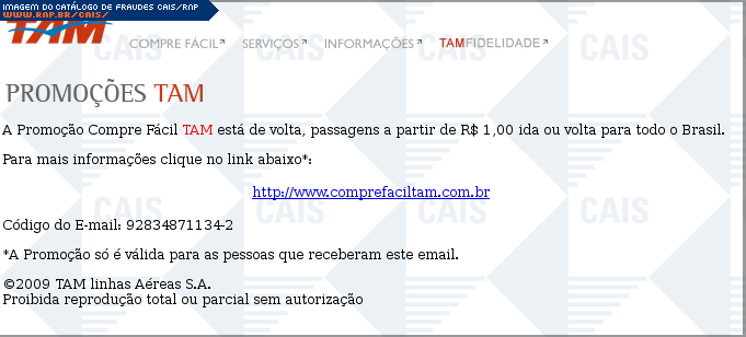 | comentário | Mensagem falsa se passando por comunicado da TAM a respeito de promoção com passagens a R$ 1,00, ida ou volta, para todo Brasil. Um link fornecido que deveria levar a maiores informações a respeito da promoção leva a um site falso para poder se cadastrar... (leia mais) | |