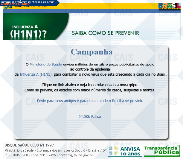| comentário | Mensagem falsa se passando pelo Ministério da Saúde a respeito de campanha de prevenção à gripe suína. O texto pede que a vítima entre no link fornecido para detalhes a respeito da epidemia, como forma de prevenção, dados de contaminação no Brasil e no mundo,... (leia mais) | |