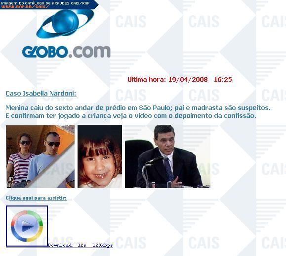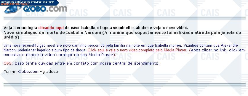 | comentário | Mais um exemplo de fraude que utiliza a tragédia ocorrida com a menina Isabella. Neste caso a mensagem fraudulenta informa sobre a cronologia do crime e disponibiliza um link de download de um vídeo. O arquivo atrelado ao link, Video.WindowsMediaplayer.exe,... (leia mais) | |
