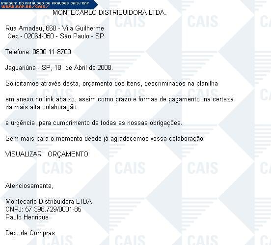 | comentário | Mensagem fraudulenta que se passa por um orçamento da empresa (?) Montercarlo Distribuidora. O arquivo malicioso atrelado a mensagem, Orcamento01245 Montecarlo LTDA.xls.com, foi identificado por antivirus como TrojanDownloader:Win32/Small.gen!B. | |