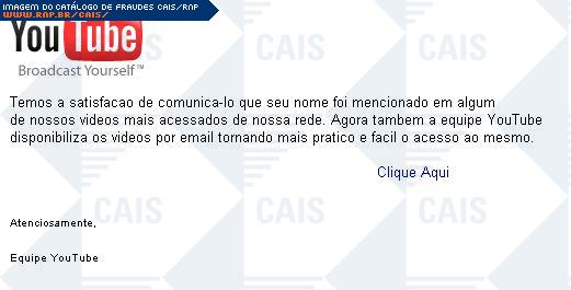 | comentário | Mais uma fraude que utiliza o nome do site YouTube com o mesmo assunto de que "seu nome" foi mencionado em um video. O diferencial neste caso é o dominio registrado pelos fraudadores que se assemelha em muito com o dominio original. O arquivo YouTube.exe... (leia mais) | |