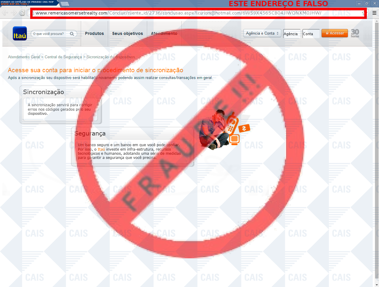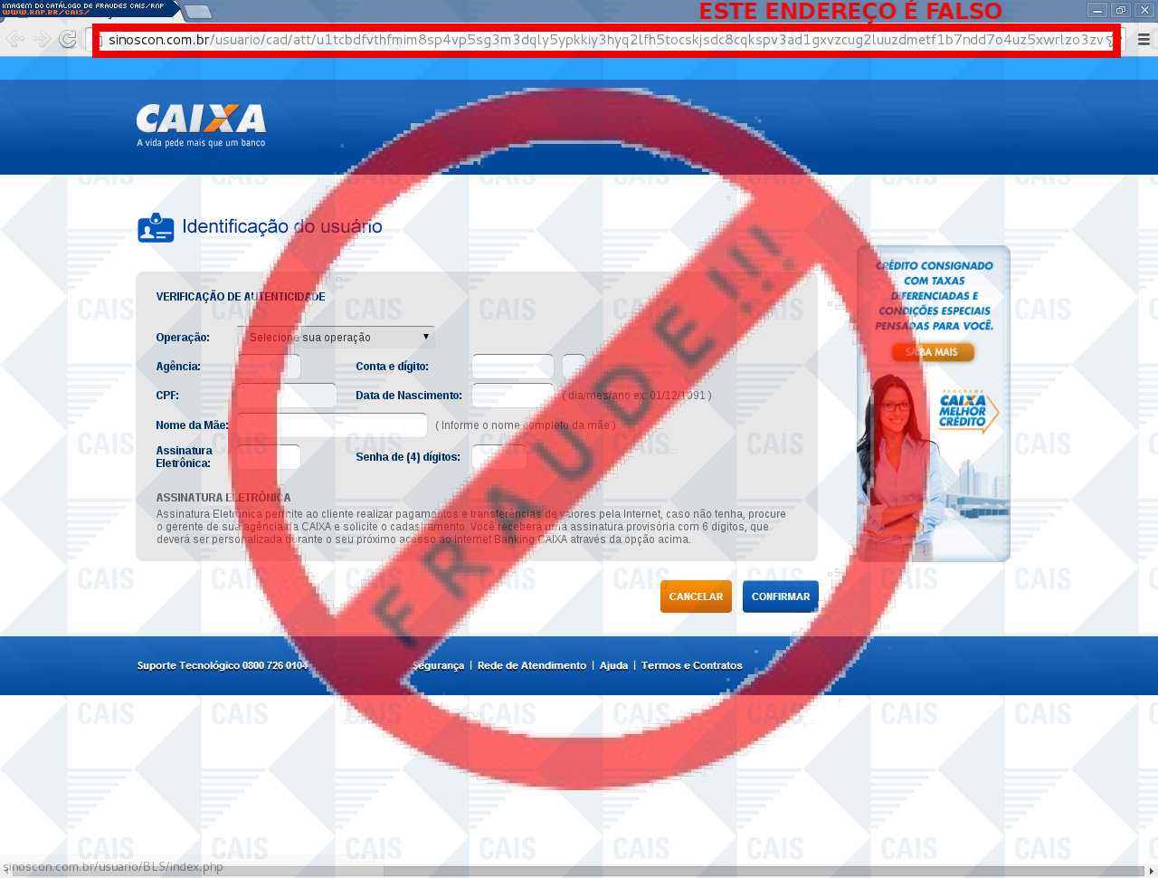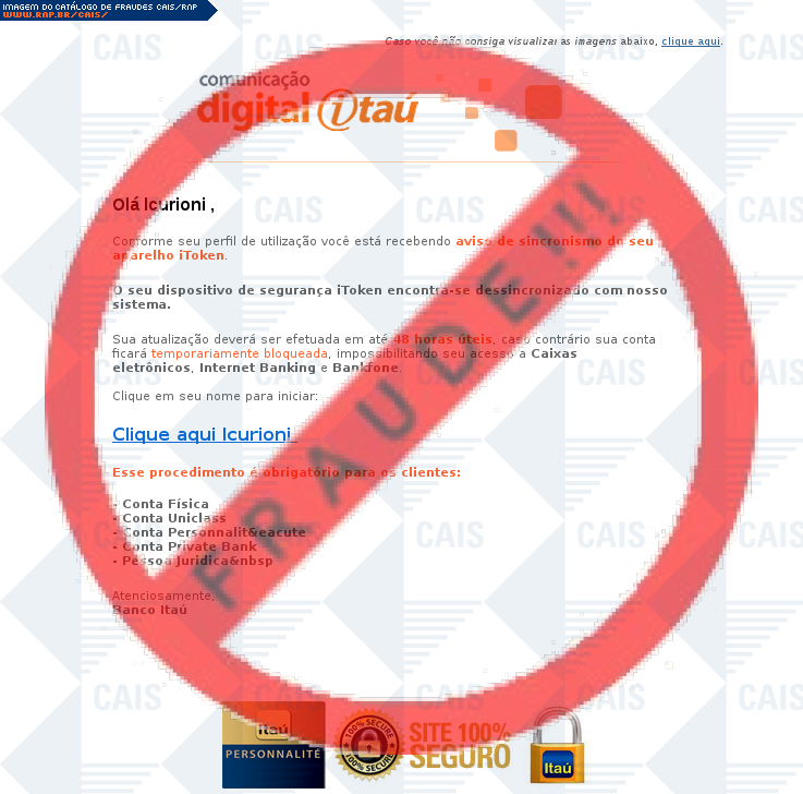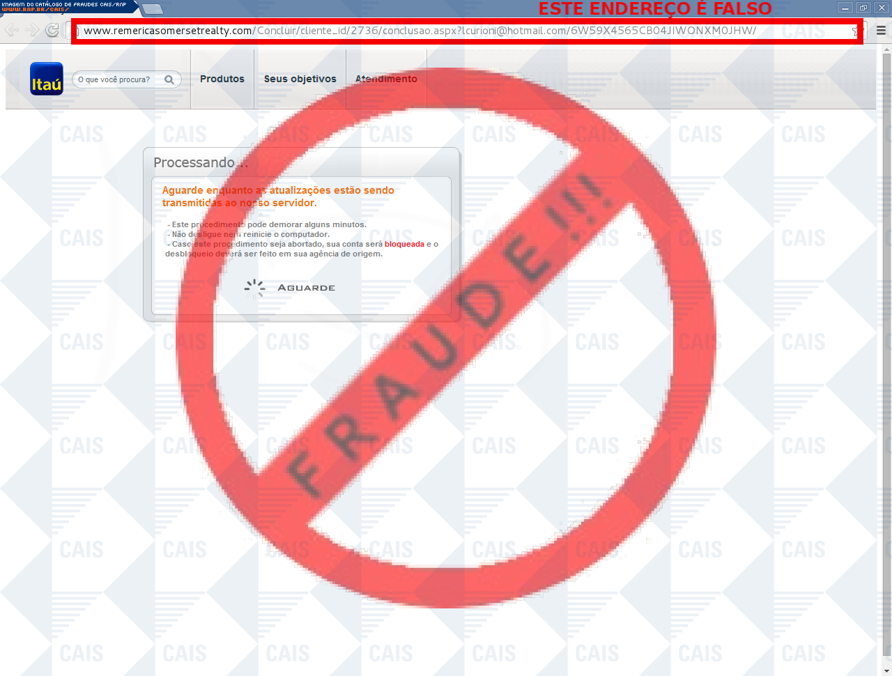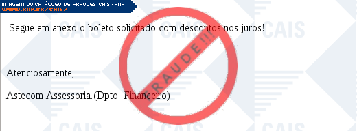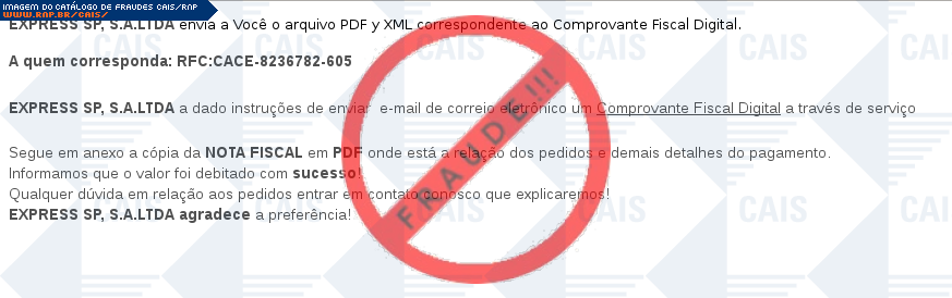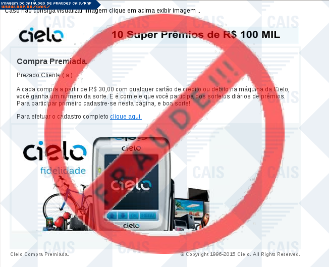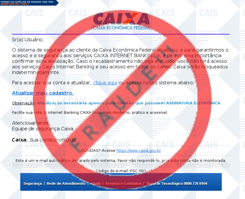 Esta página tem função informativa e educativa. Exibe uma coleção de imagens de phishing scam (fraudes eletrônicas) ou malware (código malicioso) veiculados por meio de spam (e-mail não-solicitado). Trata-se de conteúdo exemplificativo, não exaustivo, uma vez que não é possível contemplar todos os casos de fraudes existentes. Assim, caso você tenha conhecimento de um exemplar que não esteja aqui presente, isto não significa que não seja válido ou real. Inclusive incentivamos que você o envie para análise do CAIS para que, se for o caso, passe a integrar o nosso acervo.