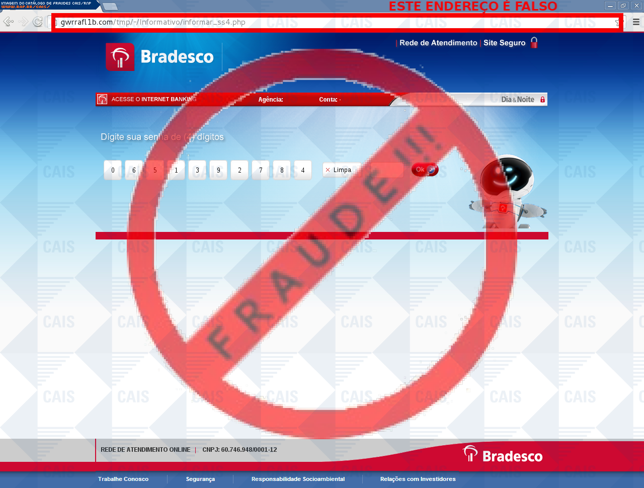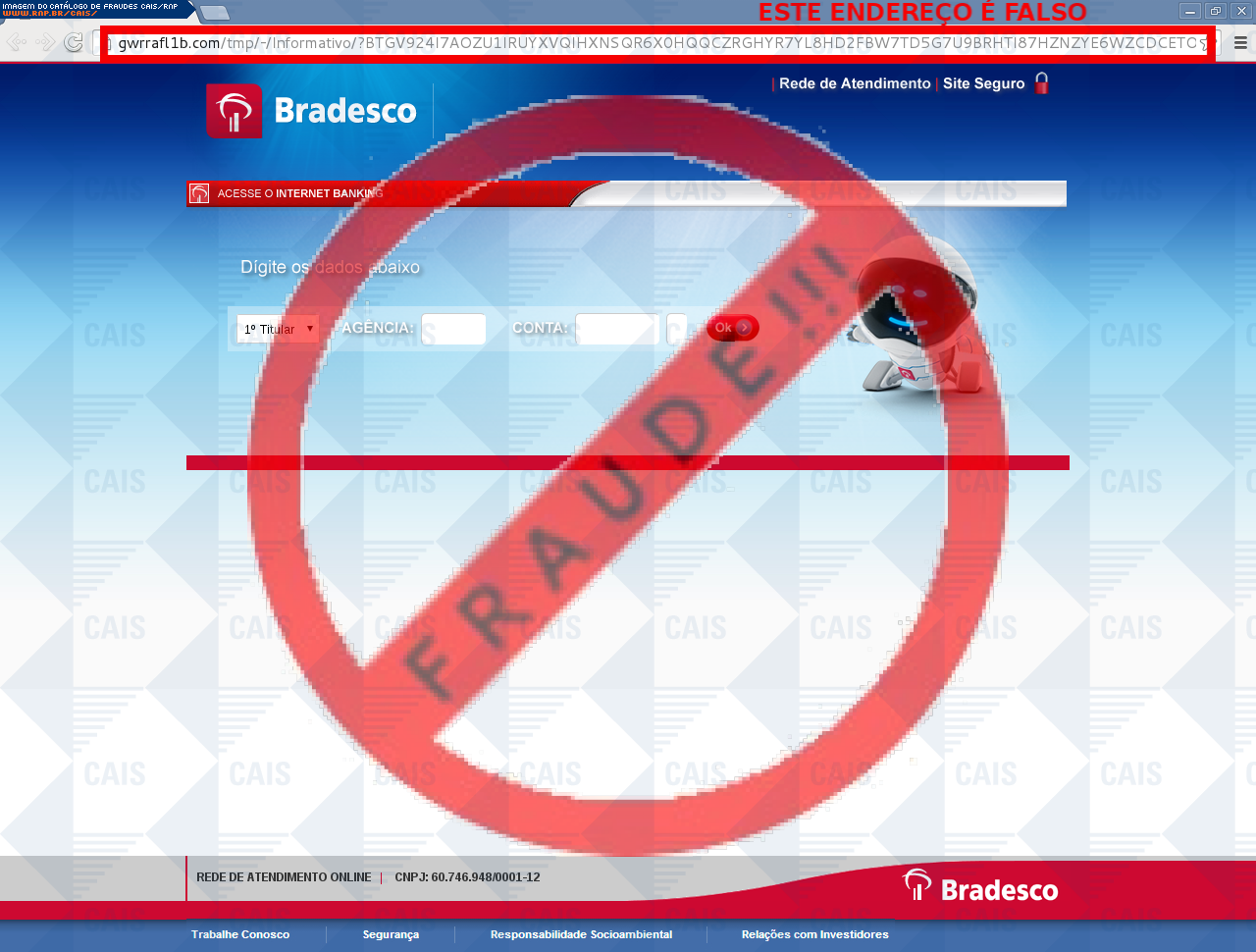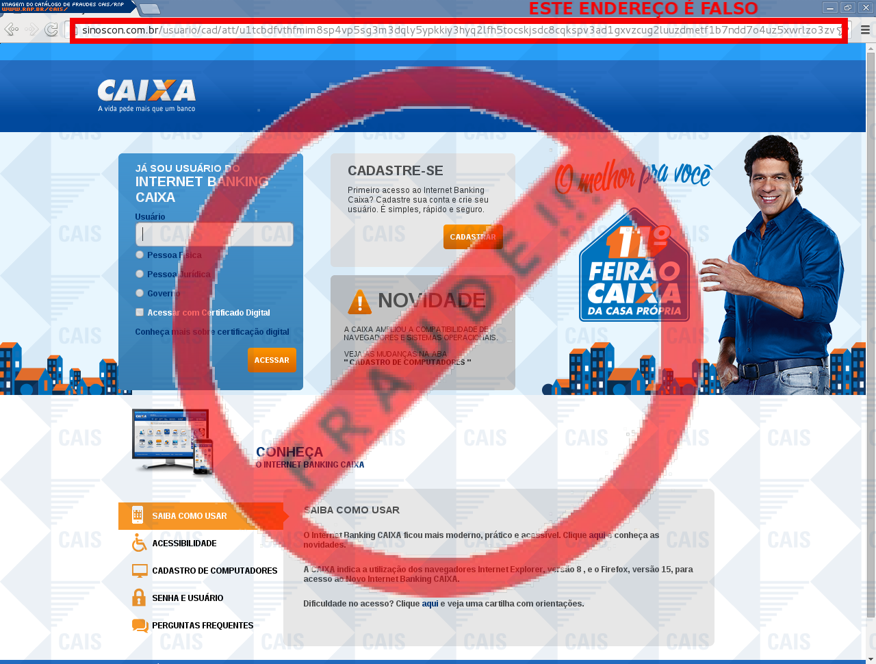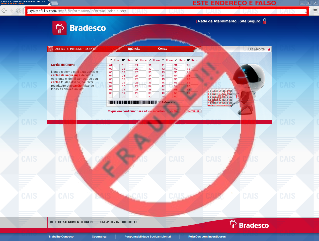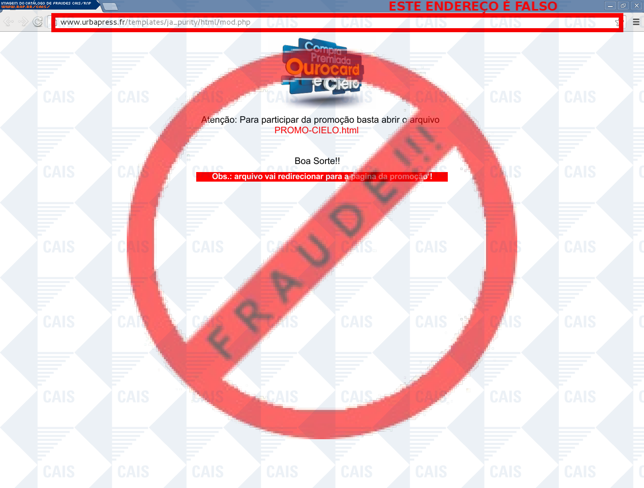 Esta página tem função informativa e educativa. Exibe uma coleção de imagens de phishing scam (fraudes eletrônicas) ou malware (código malicioso) veiculados por meio de spam (e-mail não-solicitado). Trata-se de conteúdo exemplificativo, não exaustivo, uma vez que não é possível contemplar todos os casos de fraudes existentes. Assim, caso você tenha conhecimento de um exemplar que não esteja aqui presente, isto não significa que não seja válido ou real. Inclusive incentivamos que você o envie para análise do CAIS para que, se for o caso, passe a integrar o nosso acervo.