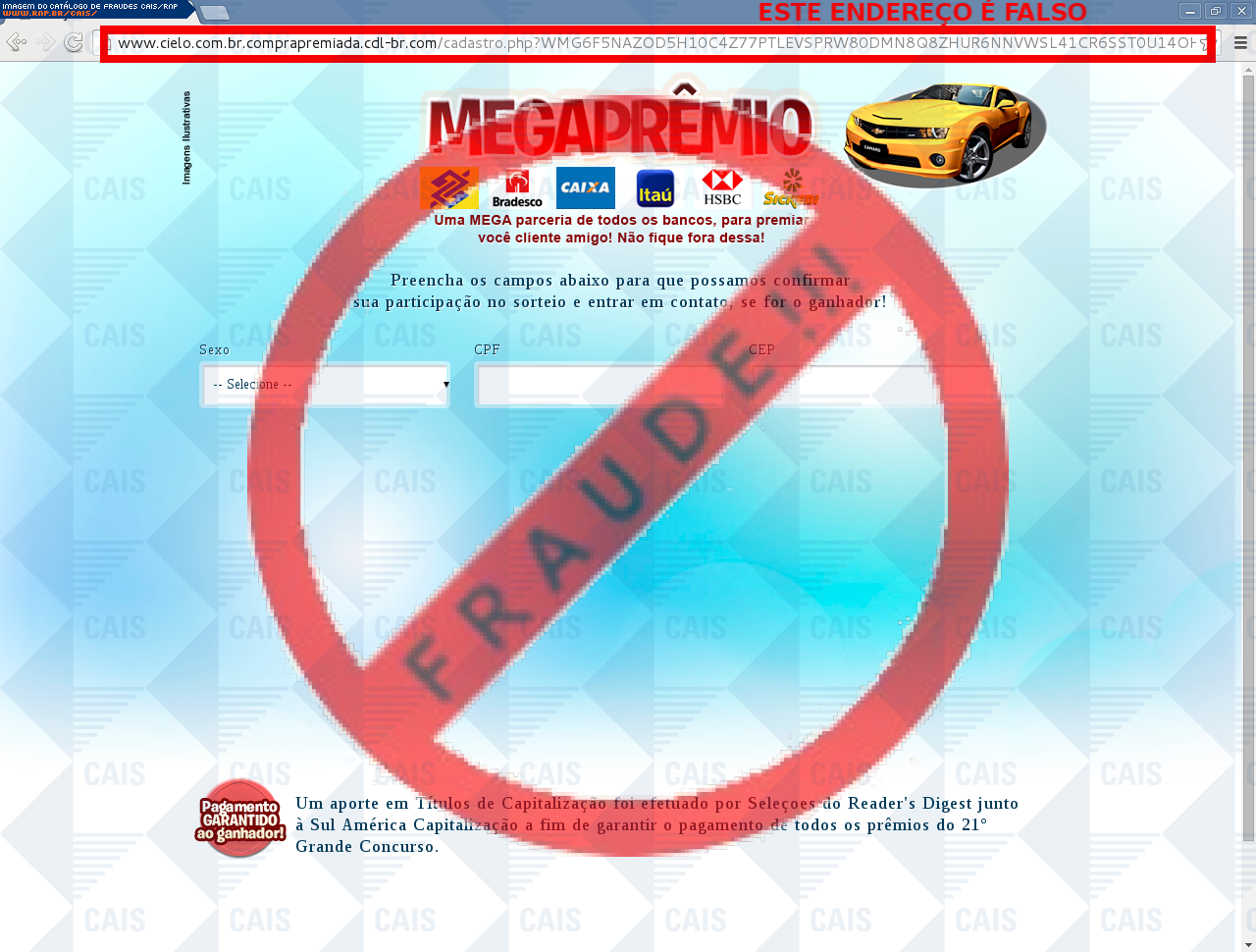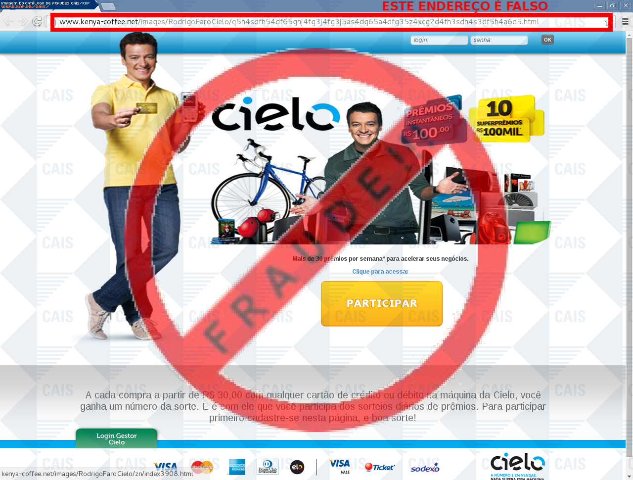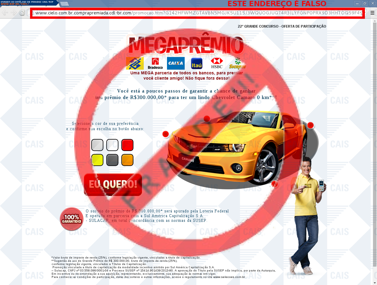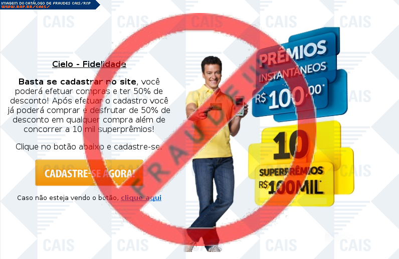 | comentário | A vítima recebe um e-mail informando sobre as vantagens da promoção compra premiada do cartão Cielo sendo o cadastro através do link disponibilizado, no entanto a página é falsa criada para roubar informações do usuário. | |