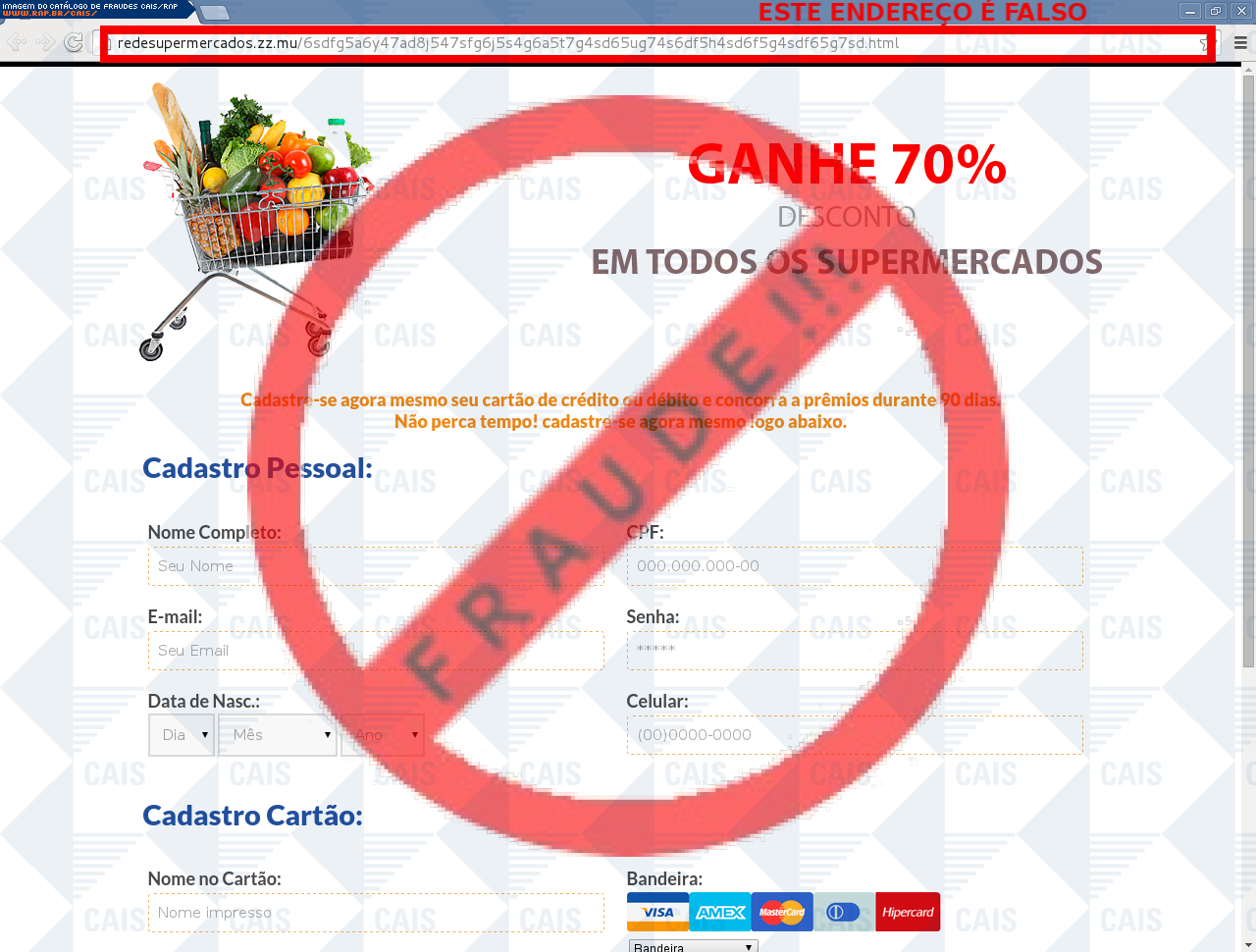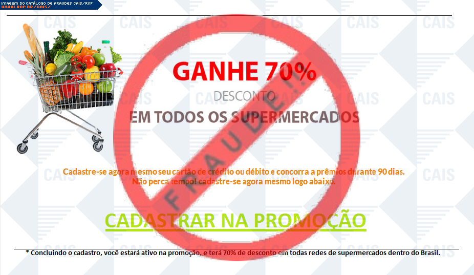 | comentário | A vítima recebe um e-mail informando sobre promoções relacionadas a compras em supermercados no Brasil sendo necessário realizar um cadastro, no entanto a página é falsa destinada a roubar os dados do cartão de crédito do usuário. | |