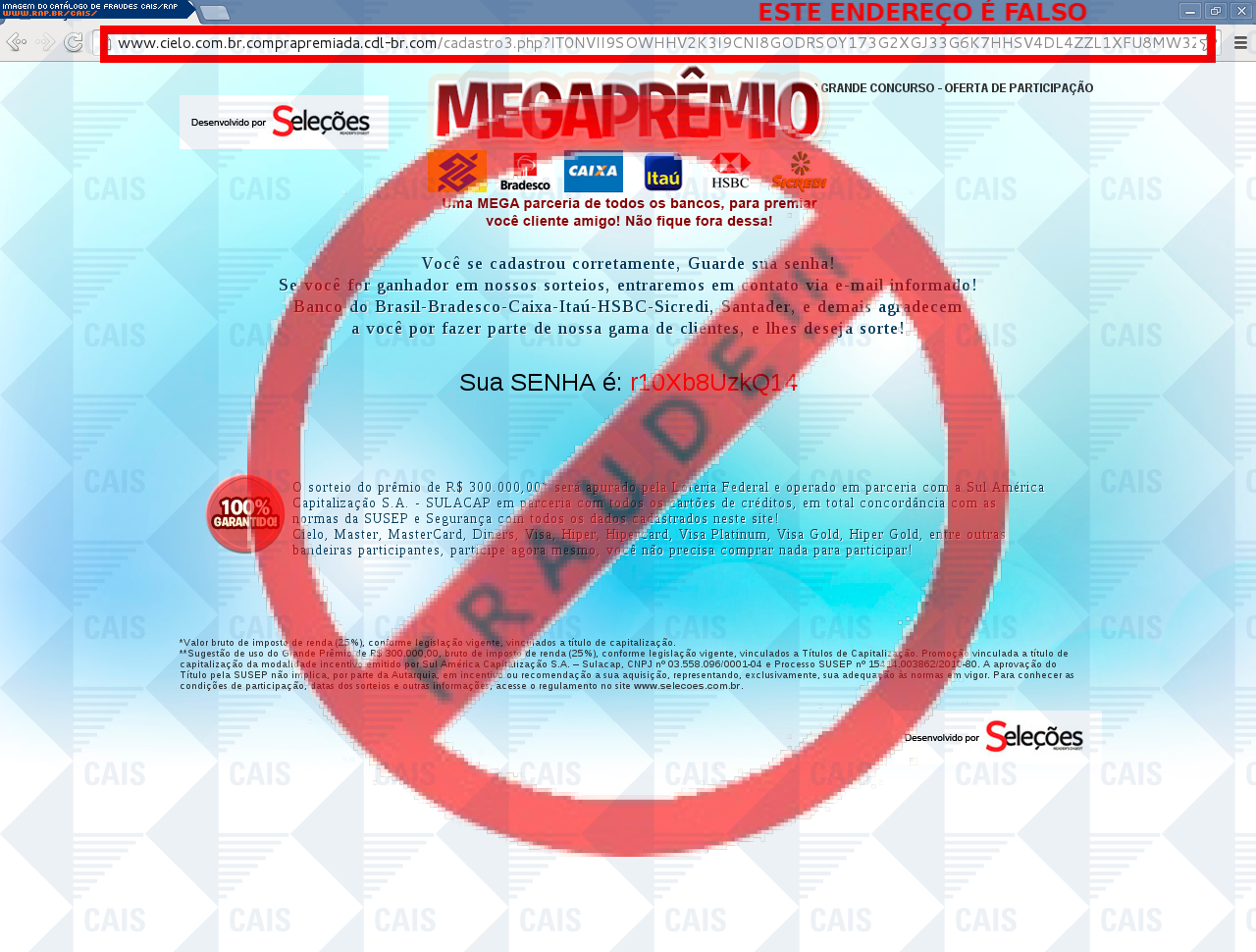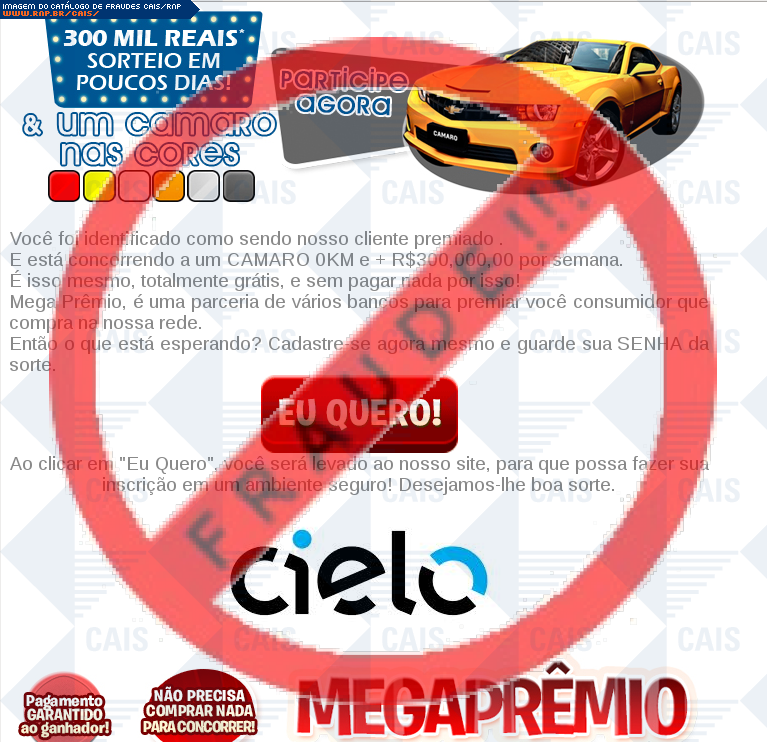 | comentário | A vítima recebe um e-mail informando sobre as vantagens da promoção Mega Prêmio do cartão Cielo sendo o cadastro através do link disponibilizado, no entanto a página é falsa criada para roubar informações do usuário. | |