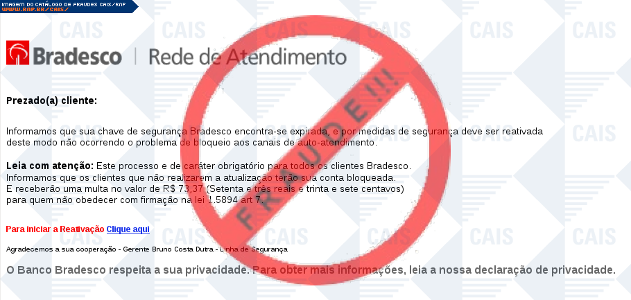 | comentário | O usuário recebe um e-mail informando que sua chave de segurança da conta do banco Bradesco expirou sendo necessário realizar uma atualização no link disponibilizado, entretanto a página fornecida é falsa criada para roubar os dados bancários da vítima. | |