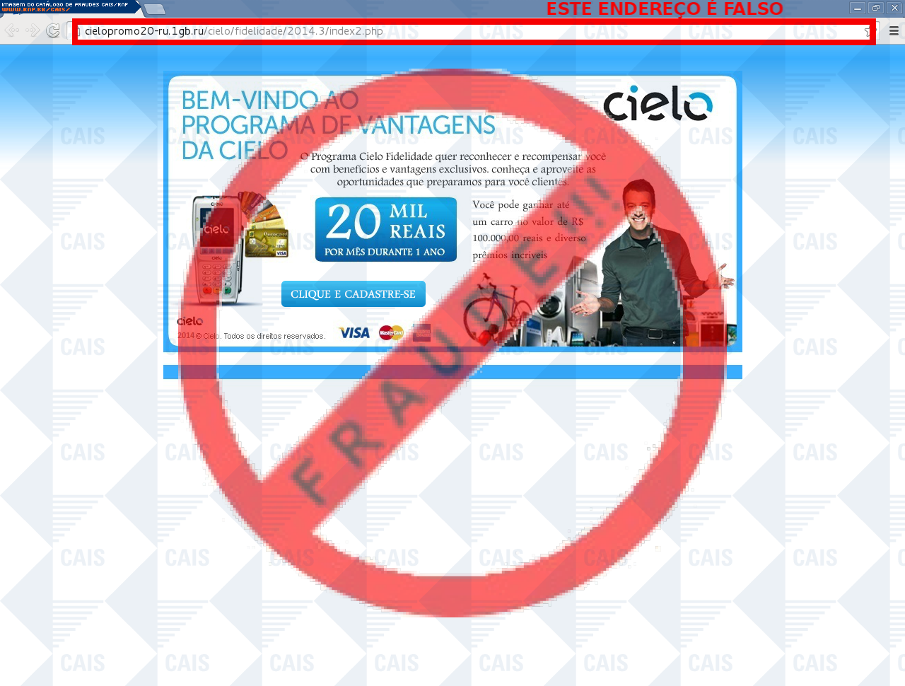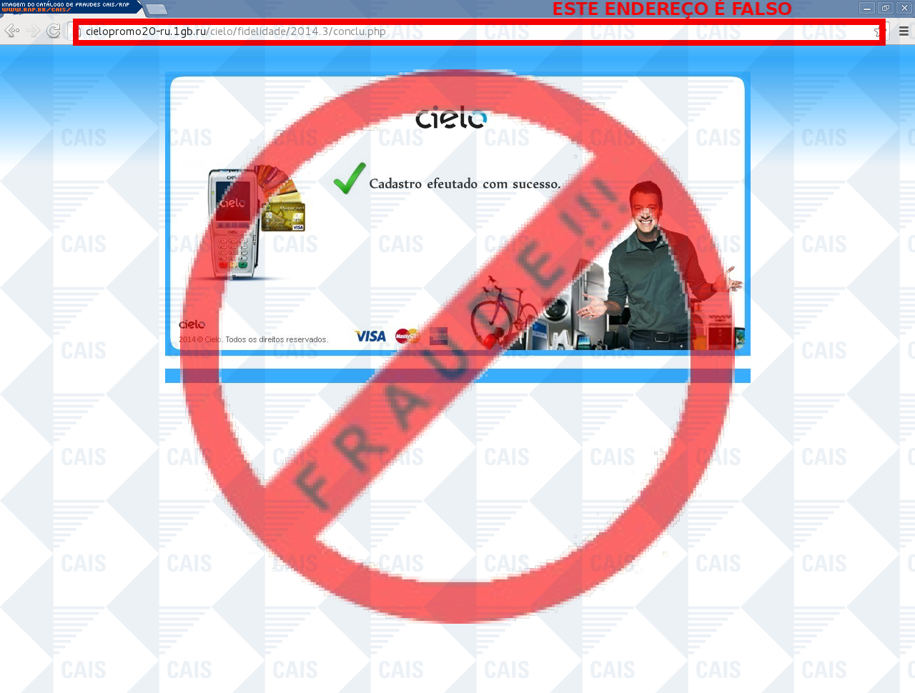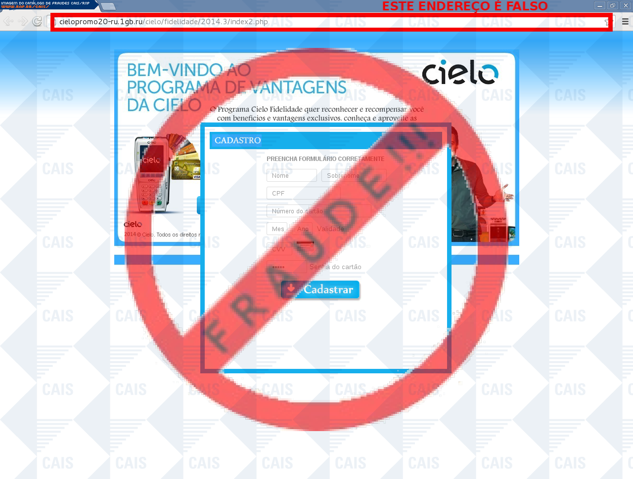 | comentário | A vítima recebe um e-mail informando sobre os benefícios do programa de fidelidade do cartão Cielo disponibilizando o link para cadastro, no entanto a página é falsa criada para roubar as informações do cartão da vítima. | |