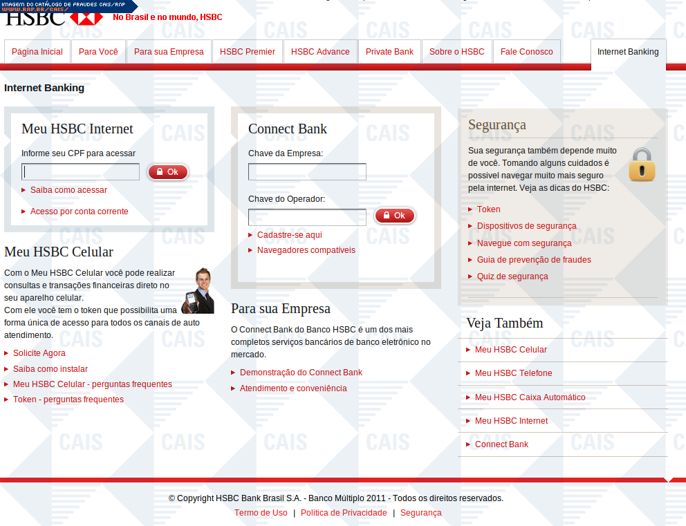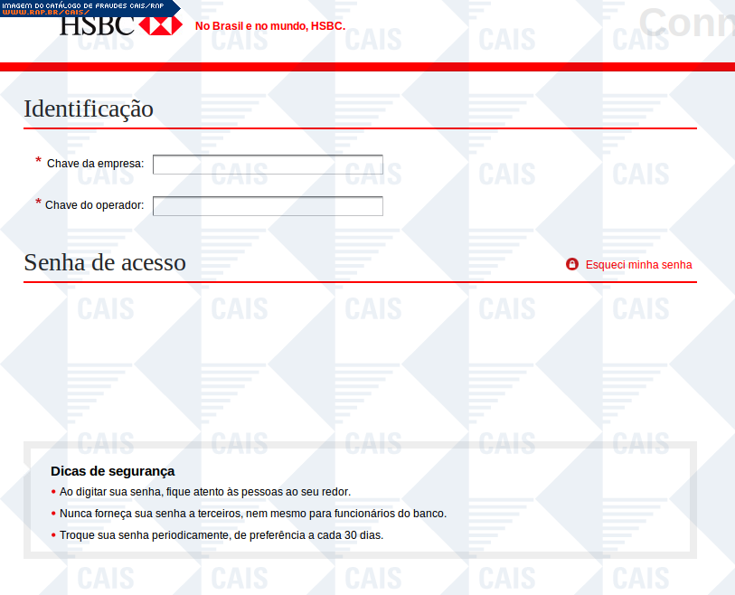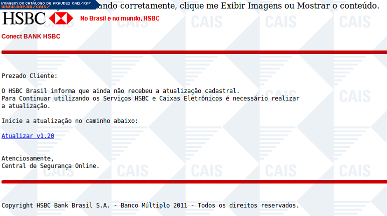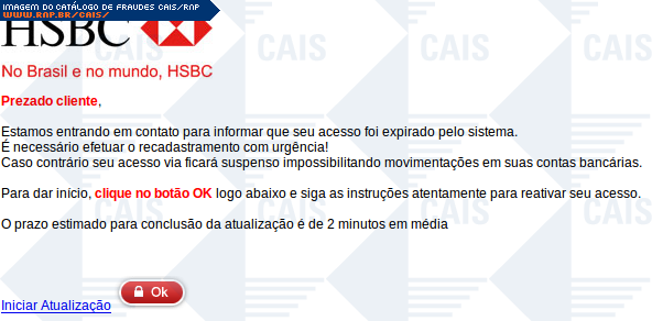| comentário | Comunicado para efetuar a atualização de cadastro no banco HSBC. Após acessar o link, é aberta uma página clonada do banco, com o objetivo de roubar as chaves "Empresa" e "Operador" para se ter acesso ao Connect Bank. | |