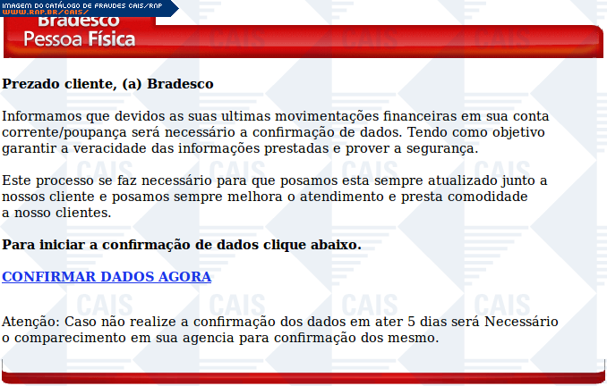 | comentário | Mensagem se passando pelo Banco Bradesco alertando que, em decorrência de supostas movimentações financeiras, é necessário que a vítima confirme seus dados. A fraude contém um link para a confirmação dos dados. Tal link leva a um site falso destinado a roubar... (leia mais) | |