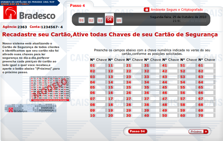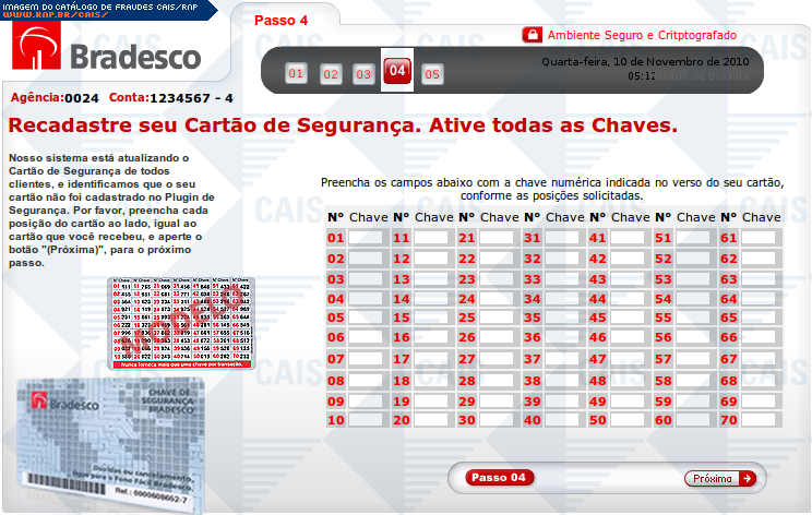 | comentário | Mensagem se passando pelo Banco Bradesco solicitando a atualização do cartão de chaves de segurança. A fraude contém um link que leva a uma página falsa destinada a roubar dados sigilosos da vítima. | |