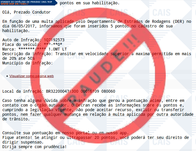 Esta página tem função informativa e educativa. Exibe uma coleção de imagens de phishing scam (fraudes eletrônicas) ou malware (código malicioso) veiculados por meio de spam (e-mail não-solicitado). Trata-se de conteúdo exemplificativo, não exaustivo, uma vez que não é possível contemplar todos os casos de fraudes existentes. Assim, caso você tenha conhecimento de um exemplar que não esteja aqui presente, isto não significa que não seja válido ou real. Inclusive incentivamos que você o envie para análise do CAIS para que, se for o caso, passe a integrar o nosso acervo.