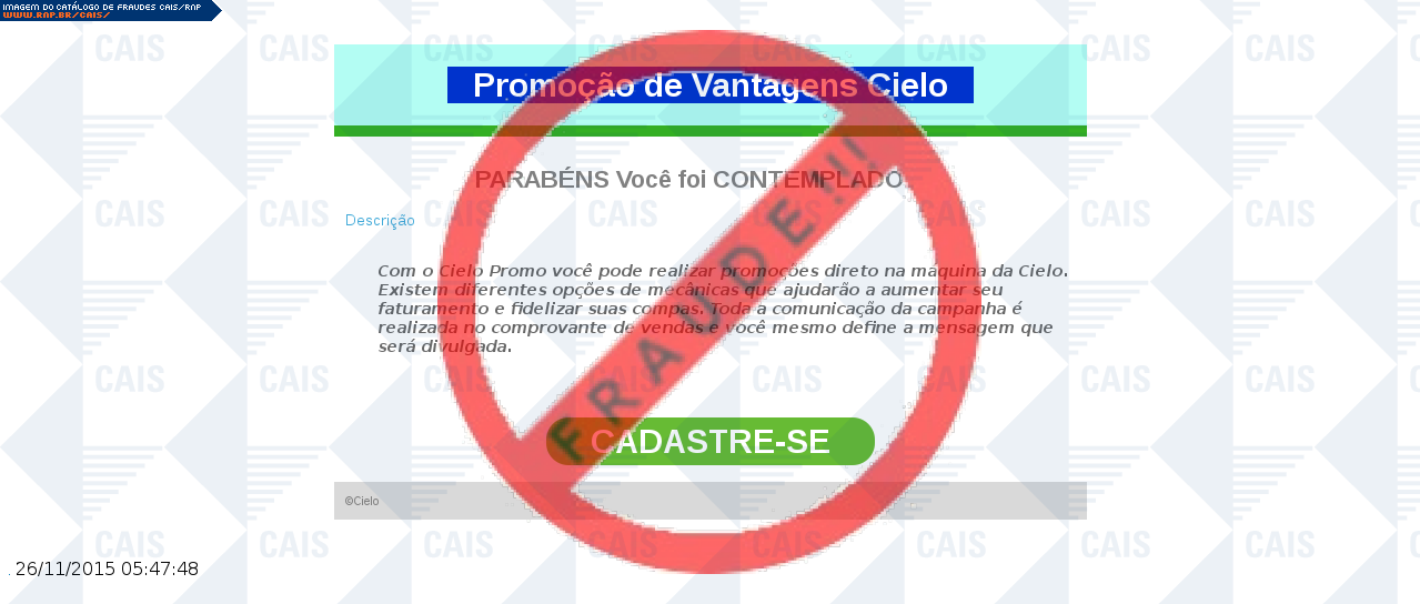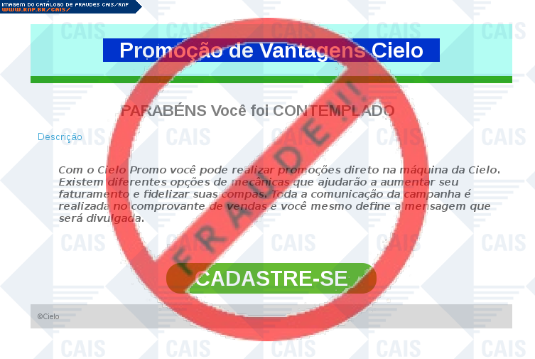 | comentário | A vítima recebe um email com uma suposta promoção da Cielo oferecendo chance de concorrer a prêmios mediante cadastro no site da promoção. Entretanto, o link na mensagem leva a um site falso que tenta roubar informações de cartão de crédito da vítima. | |