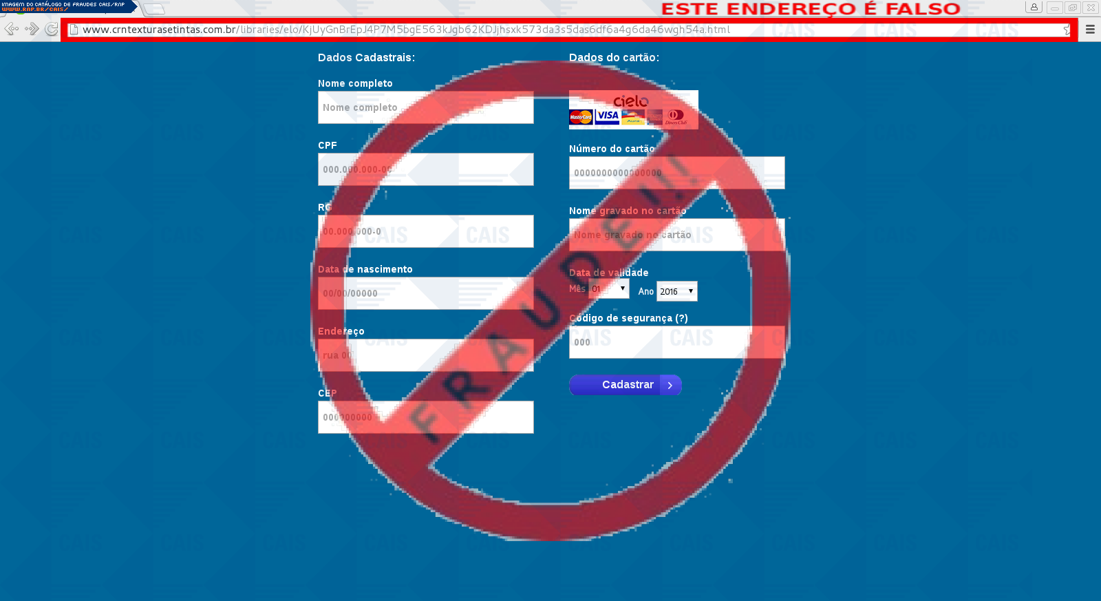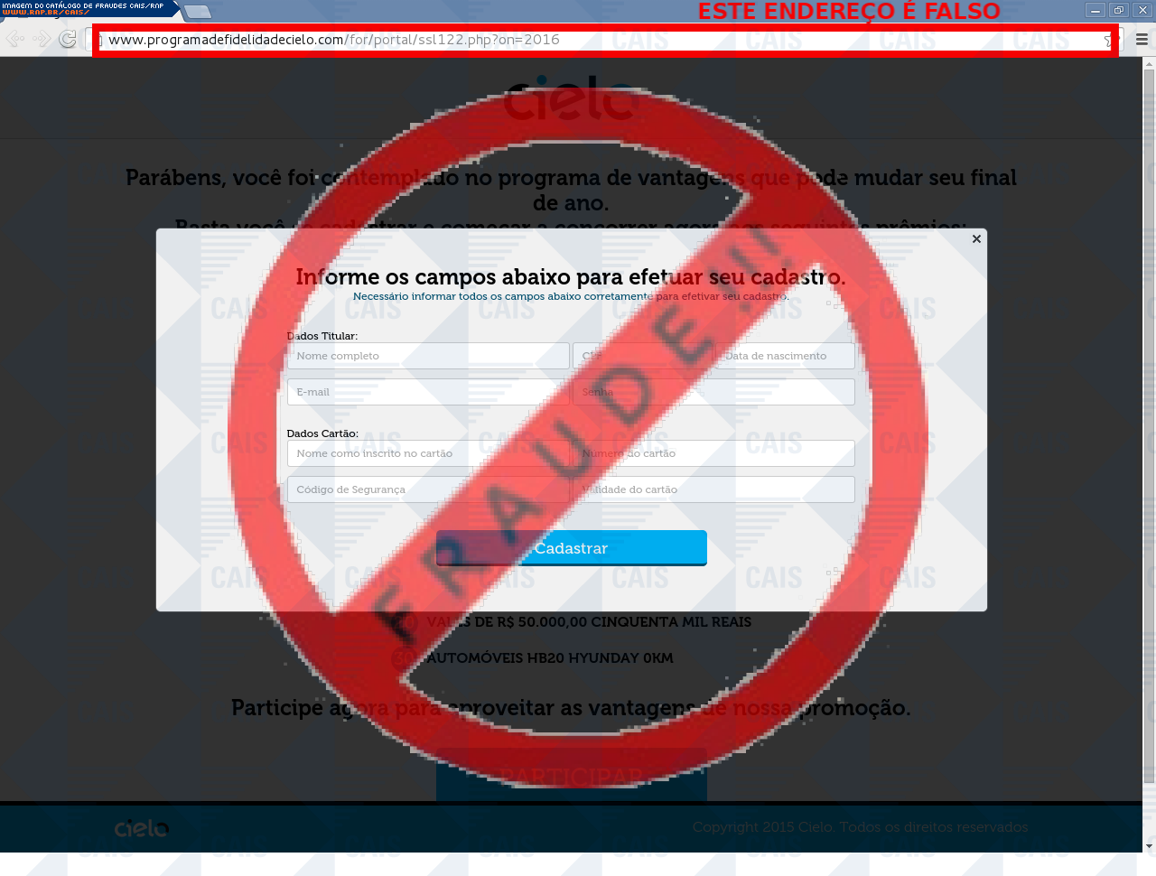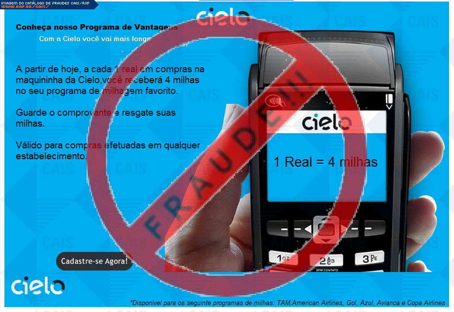 | comentário | A vítima recebe um e-mail informando sobre os benefícios do programa de vantagens do cartão Cielo disponibilizando o link para cadastro, no entanto a página é falsa criada para roubar as informações do cartão da vítima. | |