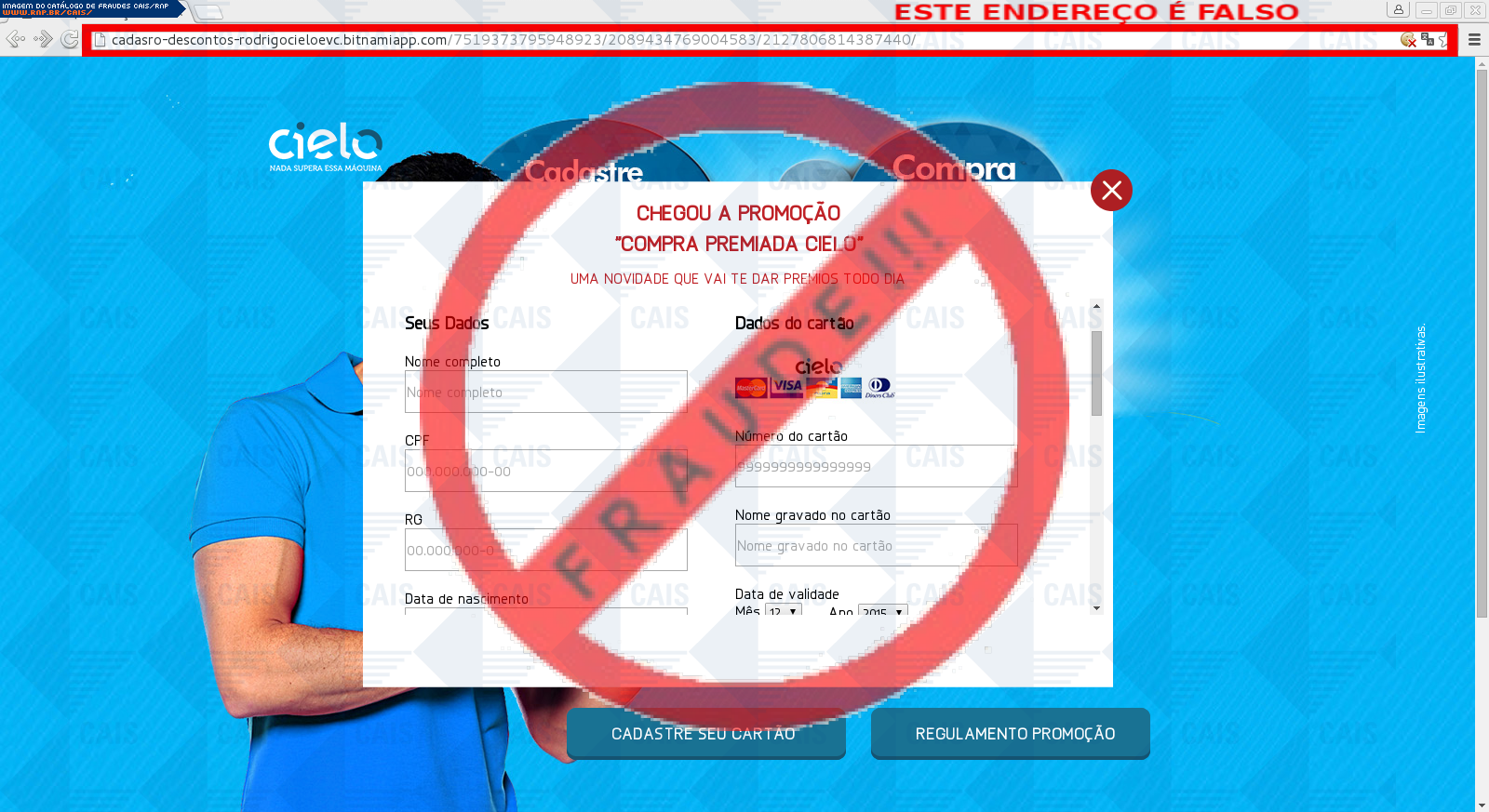 | comentário | A vítima recebe um e-mail informando sobre as vantagens da promoção compra premiada do cartão Cielo juntamente com o Banco do Brasil sendo o cadastro através do link disponibilizado, no entanto a página é falsa criada para roubar informações do usuário. | |