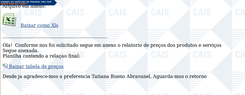 | comentário | A mensagem se passa pelo envio de uma suposta tabela de preços que teria sido solicitada pela vítima. O arquivo malicioso foi identificado como Worm.Win32.VB (Ikarus). | |